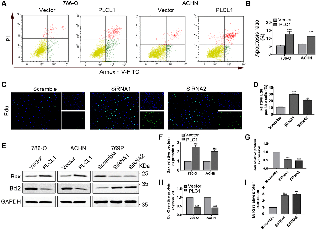 To further explore whether PLCL affects RCC apoptosis in vitro, flow cytometry and EdU analysis were performed. As indicated in Figure 3A, 3B, compared to the vector group, overexpression of PLCL1 significantly induced apoptosis of tumour cells, especially the early stage of apoptosis, while the ratio of proliferation was dramatically promoted in 769P cells treated with PLCL1 siRNA (Figure 3C, 3D). The Bcl-2 family has been documented to play a crucial role in the regulation of tumour cell apoptosis [20]. Therefore, two important regulators, Bax and Bcl2, were assessed using western blotting (Figure 3E and Supplementary Figure 3). As shown in Figure 3G, 3H, compared to that in the control cells, protein expression of Bax was increased, while levels of Bcl2 were decreased in 786-O and ACHN cells overexpressing PLCL1. Interestingly, the anti-apoptotic regulator Bcl2 exhibited the opposite results in the siRNA groups (Figure 3F–3I). Collectively, these data suggest that PLCL1 induces renal tumour cell apoptosis by upregulating Bax/Bcl2 expression.