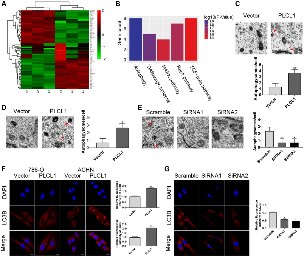 An increasing number of studies have demonstrated the crucial role of autophagy in RCC pathogenesis [21]. To determine whether PLCL1 affects autophagy during the development of RCC, 786-O cells transfected with PLCL1 or vector and were subjected to high-throughput RNA-sequencing (Figure 4A). KEGG pathway enrichment analysis of DEGs indicated that the top five pathways were autophagy, GABAergic synapse, MAPK signalling pathway, Rap1 signalling pathway and TGF-beta signalling pathway (Figure 4B). Interestingly, the transmission electron microscopy (TEM) results showed that PLCL1 significantly increases the numbers of autophagosomes/autolysosomes in 786-O and ACHN cells compared with those in the vector group (Figure 4C, 4D), but 769P cells with PLCL1 knockdown exhibited reduced accumulation of autophagosomes/autolysosomes compared with those in the scrambled group (Figure 4E). This autophagic phenotype was further supported by the immunofluorescence results of LC3B, an important marker of autophagy, which exhibited significant accumulation of LC3 puncta in the PLCL1 overexpression group (Figure 4F). Compared to the scrambled cells, knockdown of PLCL1 reduced autophagic vesicles in 769P cells (Figure 4G). These results all indicated that PLCL1 has an important relationship with autophagy.
