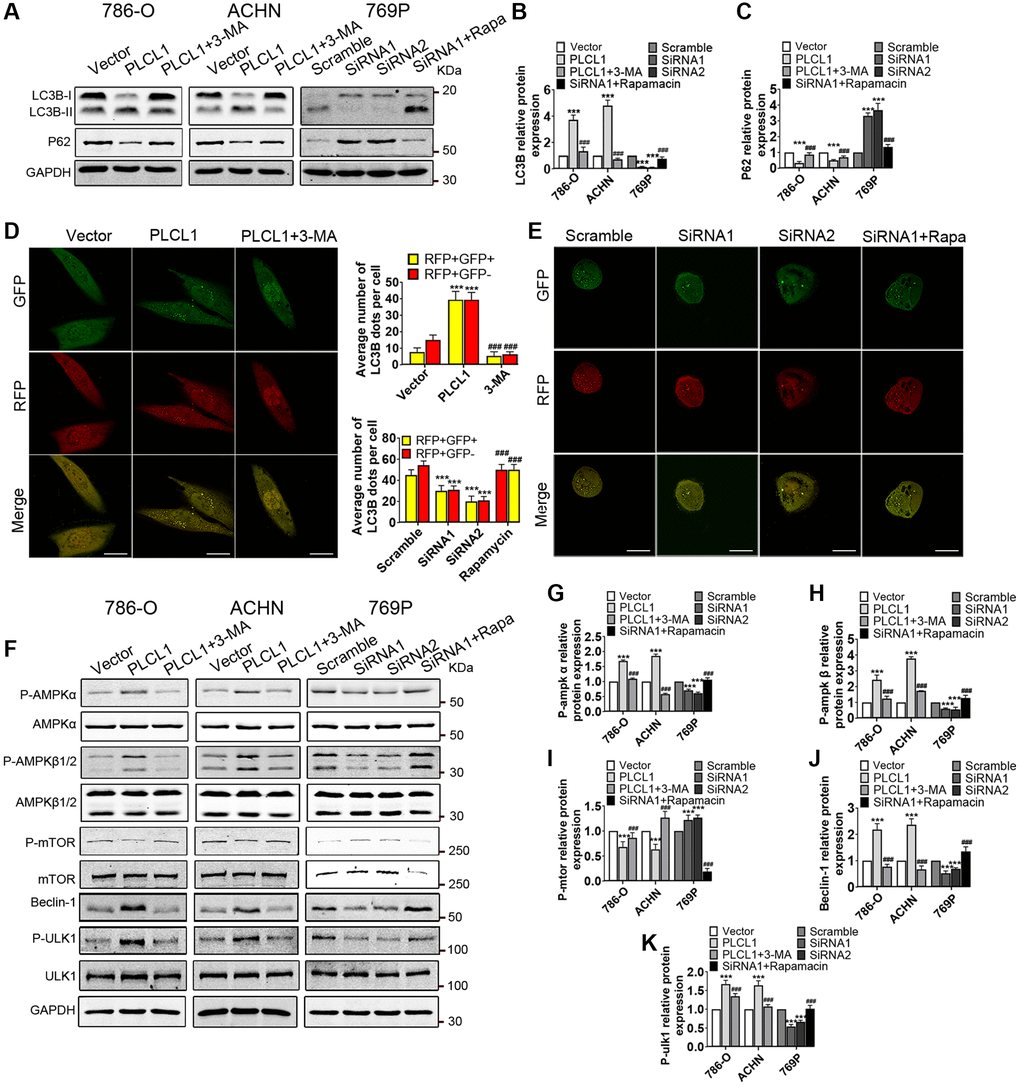 To investigate whether PLCL1 promotes autophagic flux, RCC cells were treated with 3-MA or rapamycin, and western blotting was performed to determine the protein levels of microtubule-associated protein 1 light chain 3β (LC3B) and sequestosome 1 (SQSTM1 or p62). As shown in Figure 5A, PLCL1 markedly increased levels of LC3B-II and decreased expression of p62; however, protein expression levels were decreased by treatment with 3-MA, an autophagy inducer. Interestingly, silencing PLCL1 using siRNA1 and siRNA2 resulted in the opposite results for LC3B-II and p62 compared to the scrambled group (Figure 5B, 5C). These results suggest that autophagy is ibzinitiated. Autophagic flux was then assessed in 786-O, ACHN and 769P cells transfected with autophagic adenovirus using a fluorescence confocal microscope. As shown in Figure 5D and Supplementary Figure 4, in PLCL1-overexpressing cells, the intensity of red puncta (autolysosomes) and yellow puncta (autophagosomes) per cell was remarkably induced and primarily accumulated in the cytoplasm compared to those in the vectors, while this change was hampered by treatment with 3-MA, suggesting that autophagic flux is promoted by PLCL1. Of note, in PLCL1 knockdown with siRNA and siRNA2 cells, the intensity of red and yellow dots was impaired compared to scrambled 769P cells, while rapamycin reversed this alteration (Figure 5E). Cumulative evidence indicates that the AMPK/mTOR signalling pathway plays a crucial role in the process of autophagy. To determine whether the AMPK/mTOR pathway has an effect on PLCL1-induced autophagy in RCC, AMPK/mTOR pathway-related proteins were examined using western blot analysis (Figure 5F). As shown in Figure 5G–5K, compared to the vector group, overexpression of PLCL1 significantly enhanced the levels of P-AMPKα, P-AMPKβ1/2, Beclin-2 and P-ULK1 and decreased the levels of P-mTOR in 786-O and ACHN cells, whereas this alteration was restored after treatment with 3-MA. These results further supported by the observation that the AMPK/mTOR pathway was activated by PLCL1 but inhibited by rapamycin in 769P cells.