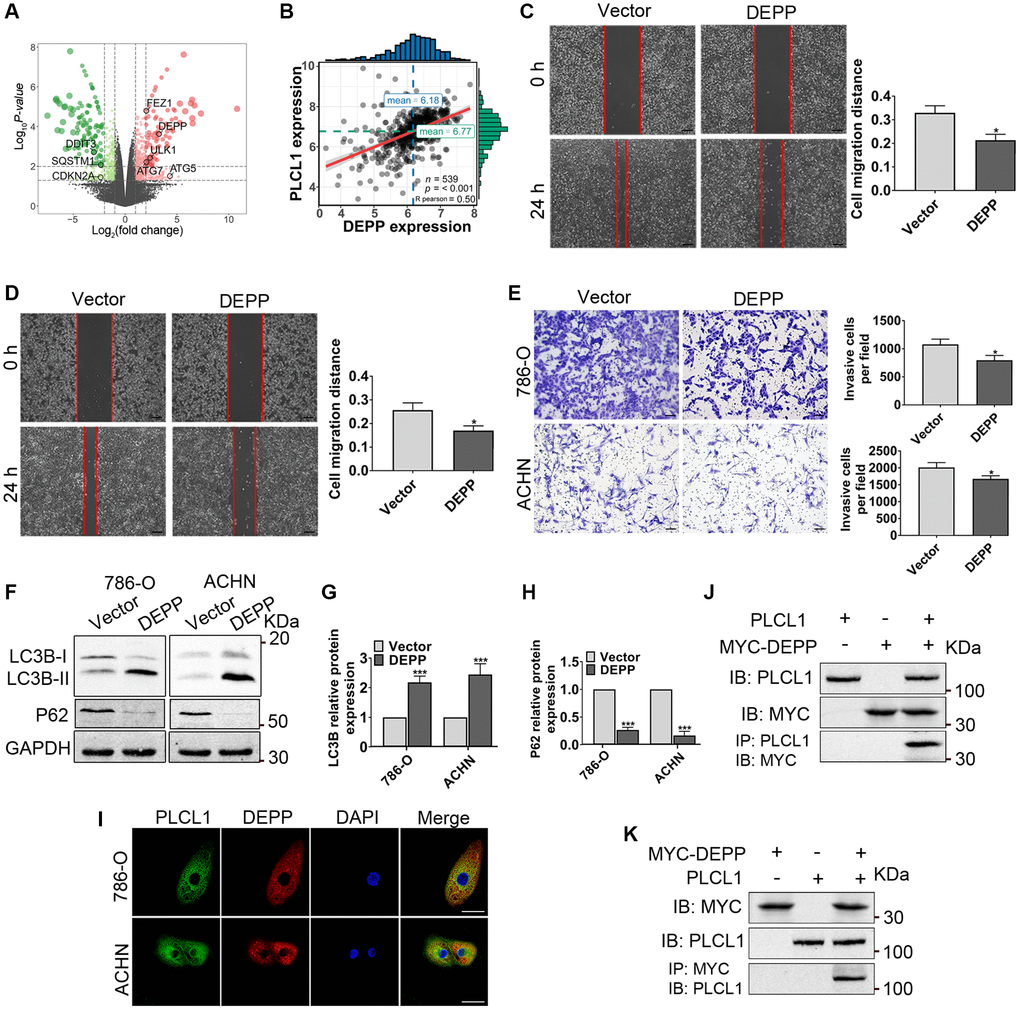 The above results reveal an important relationship between PLCL1 and the AMPK/mTOR pathway in regulating autophagy in vitro. Therefore, autophagy-related DEGs from the mRNA sequencing results were selected to further elucidate the potential mechanism between PLCL1 and the AMPK/mTOR pathway in RCC cells. As shown in Figure 6A, eight were selected, five upregulated and five regulated genes, and one of the DEGs, DEPP, was significantly positively correlated with PLCL1, exhibiting the highest correlation coefficient (R2 = 0.51, P < 0.001) in mRNA expression based on Pearson’s correlation of TCGA RCC tumours (Figure 6B). To explore the effect of DEPP on RCC progression, 786-O and ACHN cells were transfected with DEPP and vector control lentiviruses, and transfection efficiency was confirmed by RT–qPCR and western blotting (Supplementary Figure 5). The results of wound healing assays showed that DEPP remarkably inhibited migration capacity compared that in vector cells (Figure 6C, 6D). Likewise, the transwell assay indicated that compared to the control group, numbers of 786-O and ACHN cells were significantly reduced in the DEPP overexpression group (Figure 6E). Moreover, the western blotting results revealed that DEPP significantly increased the conversion of LC3B-I to LC3B-II but decreased the expression of P62, implying that DEPP might be correlated with autophagy in RCC (Figure 6F–6H). To understand the relationship between PLCL1 and DEPP, immunofluorescence and coimmunoprecipitation assays were performed. As shown in Figure 6I, PLCL1 was expressed in the cytoplasm, DEPP was primarily expressed in the cytoplasm, and the colocalization of PLCL1 and DEPP occurred mostly in the cytoplasm, illustrating that PLCL1 is correlated with DEPP in RCC cells. Then, 786-O cells were subjected to immunoprecipitation for PLCL1 and DEPP. As shown in Figure 6J, 6K and Supplementary Figure 6, reciprocal immunoprecipitation further supported the notion that PLCL1 interacts with DEPP. Meanwhile, we also found that PLCL1 co-localized with LC3BII (Supplementary Figure 7). Collectively, these results demonstrate that PLCL1 promotes autophagy by interacting with DEPP.