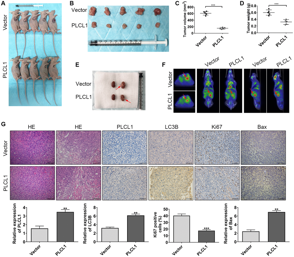 To further assess the antitumour function of PLCL1, Balb/c nude mice were used. As shown in Figure 7A–7D, compared to the vector group, PLCL1 significantly decreased the tumour volume and weight derived from the xenograft tumour model. Moreover, 786-O cells transfected with lentivirus PLCL1 or vector were injected into the left kidney of mice to establish an orthotopic tumour model (Figure 7E, red arrow). Interestingly, consistent with findings in the orthotopic model, positron emission computed tomography exhibited similar results in the horizontal, coronal and sagittal planes (Figure 7F, red arrow). Moreover, compared to vector tissues, HE of the PLCL1 group samples exhibited fewer areas of nuclear pleomorphism, and the results of IHC staining revealed increased LC3B and Bax expression levels and decreased levels of Ki67 compared to those in vector group tissues from the xenograft tumour model (Figure 7G). These data suggest that PLCL1 suppresses RCC tumour proliferation, further confirming the results in vitro.