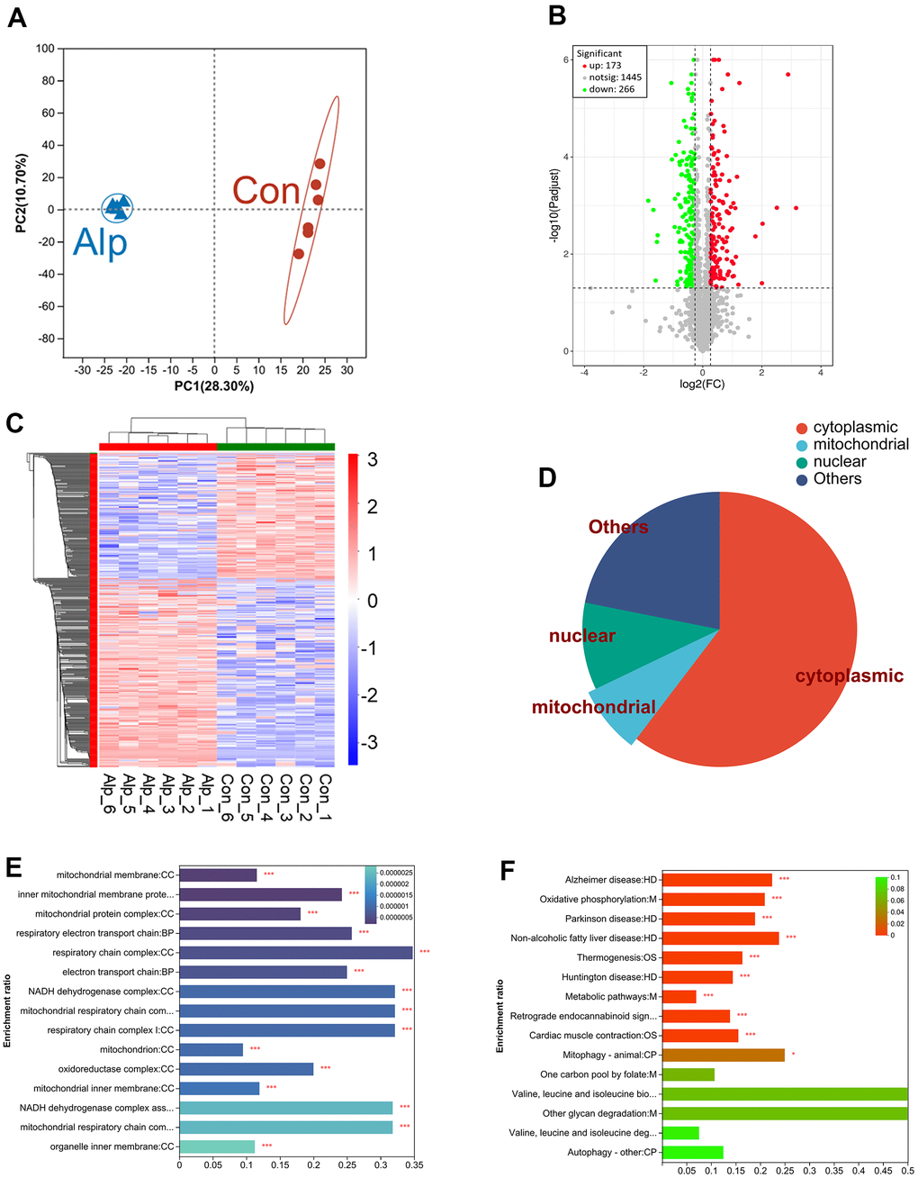 The principal component analysis (PCA) can adequately distinguish between the control and Alp groups (Figure 1A). In the DIA proteomics study, > 1869 proteins were identified and quantified with acceptable confidence. Among these, the expression of 439 proteins changed significantly, including 173 upregulated and 266 downregulated proteins (Figure 1B). The information for these 439 DEPs is shown in Supplementary Table 1.