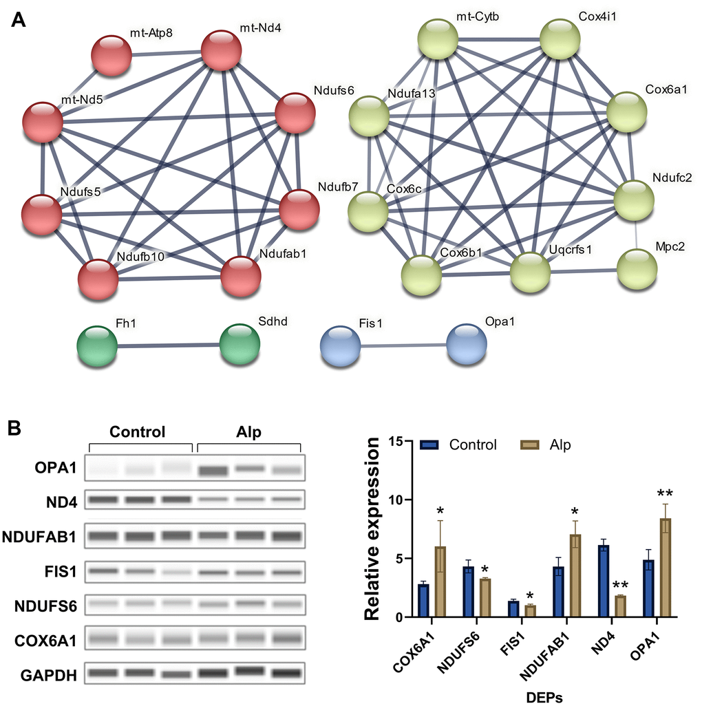 The protein network analysis of significantly differentiated proteins (Figure 2A) revealed that these are mitochondrial complex I-related proteins [28–30], mitochondrial complex II-related proteins [31], mitochondrial complex IV-related proteins [32, 33], and mitochondrial dynamics-related proteins [34], which interfere with energy metabolism processes primarily by influencing the mitochondrial electron transport chain (mETC) [35]. Most importantly, the 6 DEPS in above proteomic analysis were selected for further Western blotting validation, and the data (Figure 2B) showed that COX6A1 (p < 0.05), Ndufab1 (p < 0.05) and OPA1 (p < 0.01) in the Alp group were significantly up-regulated compared to the control group, conversely, Ndufs6 (p < 0.05), FIS1 (p < 0.05) and ND4 (p < 0.01) were significantly down-regulated. In summary, repeated administration of Alp leads to a disruption of mitochondrial functional proteins in the mouse hippocampus.