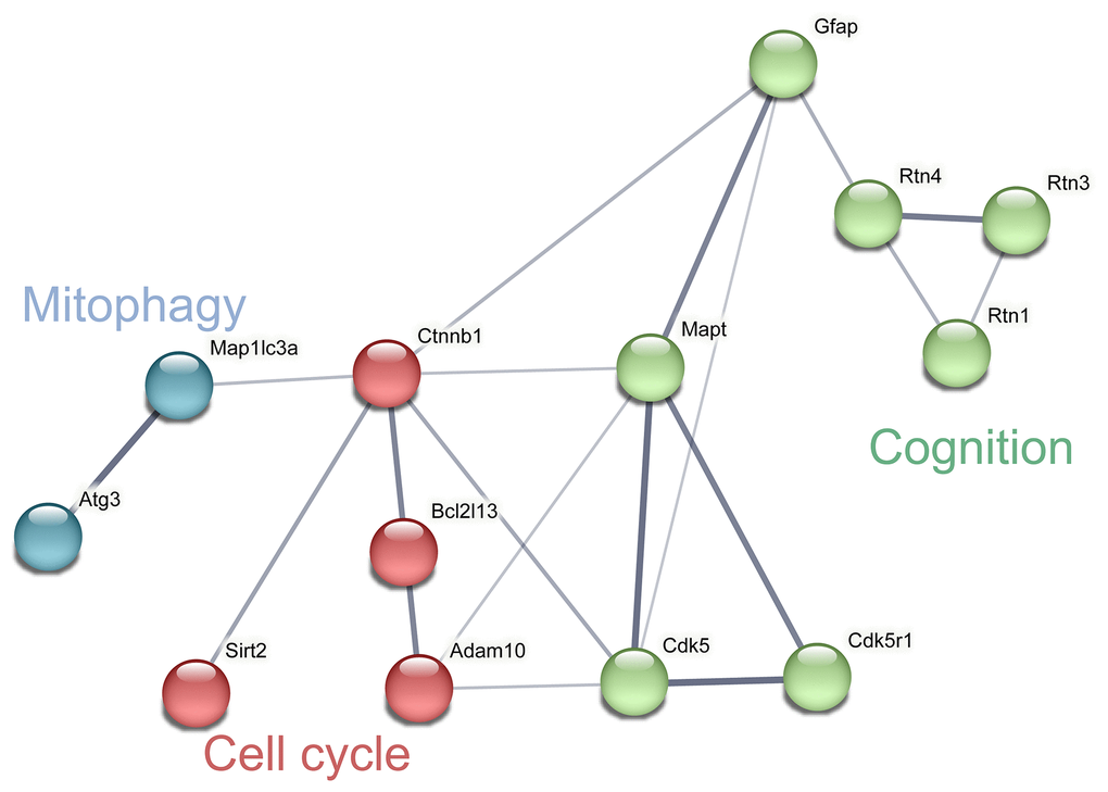 Several studies have focused on the effects of mitochondrial dysfunction in learning and memory. The proteomic results showed significant changes in the levels of cognition-related proteins, such as rising GFAP [67], falling MAPT [68] and RTN1/3/4 [69]. The increase of GFAP concentration in early plasma in AD patients suggested that it can be used as a marker for the initial diagnosis of AD [70]. MAPT plays an important role in promoting microtubule assembly and stabilizing microtubules, and the accumulation of its hyperphosphorylation induces synaptic toxicity and cognitive impairment [71].
