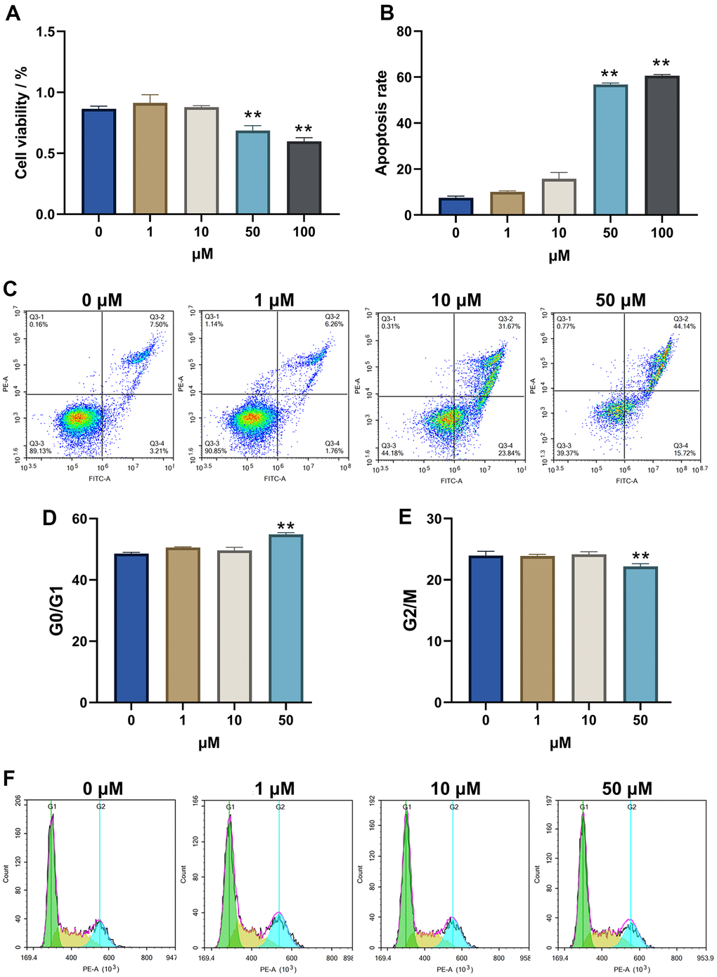 To understand the neurotoxicity of Alp-induced HT22 cells, the effects of 50 μM Alp on apoptosis and cell cycle analysis were investigated using flow cytometry. The results showed that after treatment with 50 μM Alp, the percentage of apoptosis was significantly higher than in the control group (p < 0.01) (Figure 4B, 4C).