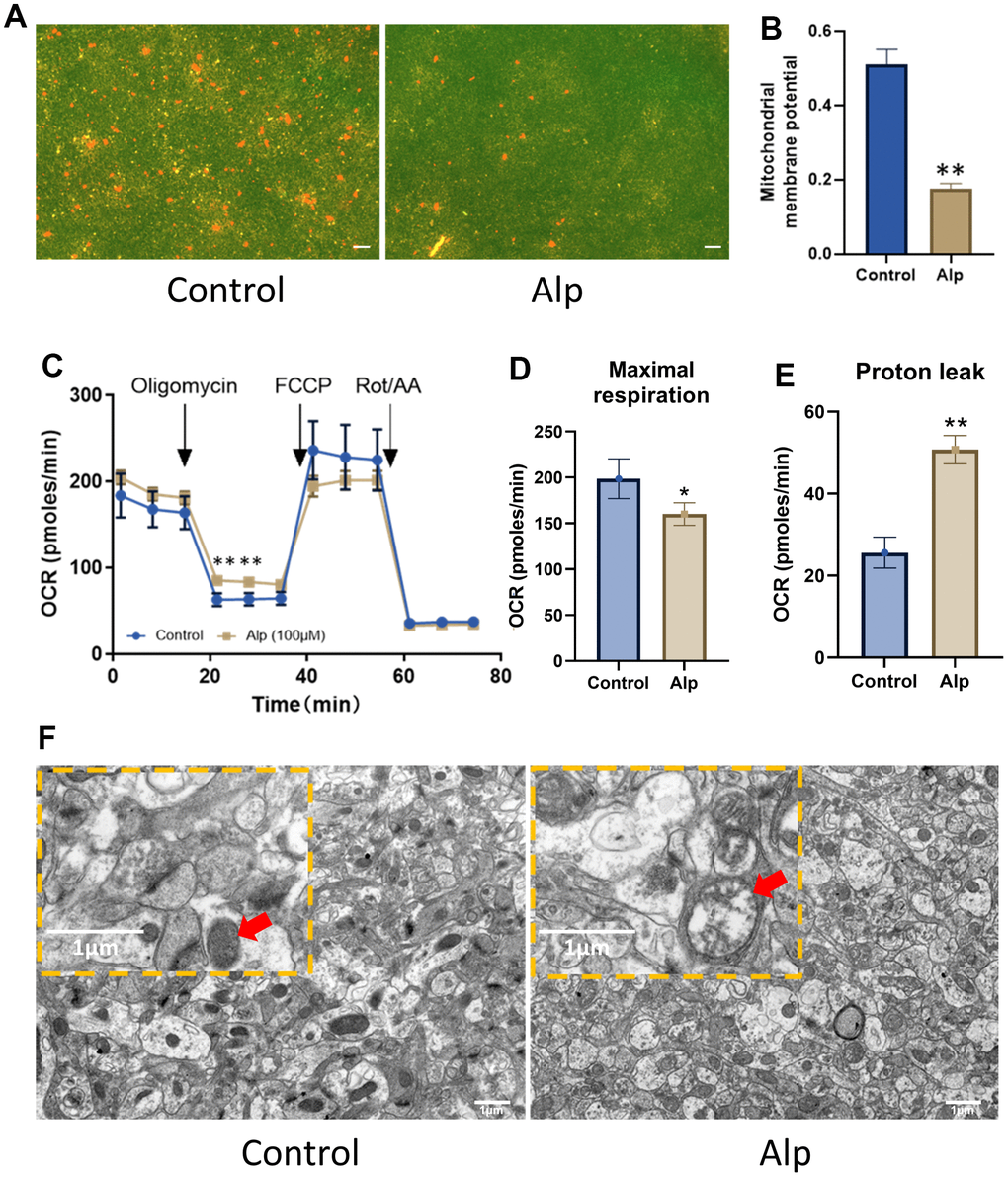 To further explore how Alp affects mitochondrial function, its effect on cellular energy metabolism in the primary hippocampal neurons was investigated. The results of mitochondrial stress tests are shown in Figure 5C. The basal OCR was the cellular OCR before the addition of 1.5 μM oligomycin at 15 min. FCCP (2 μM) and the oxidative phosphorylation coupling agent (2 μM) were added at 35 min to detect the maximum cell OCR. The respiratory reserve function was the difference between the maximum cell OCR and the basal cell OCR. Finally, 0.5 μM rotenone and 0.5 μM antimycin A were added at 50 min to detect the non-mitochondrial respiration of cells. OCR data (Table 3) showed that compared to the control group, 50 μM Alp significantly reduced the maximum respiratory capacity (p < 0.05) of neurons and increased their proton drain (Figure 5D, 5E) (p < 0.01), which resulted in mitochondrial function damage.