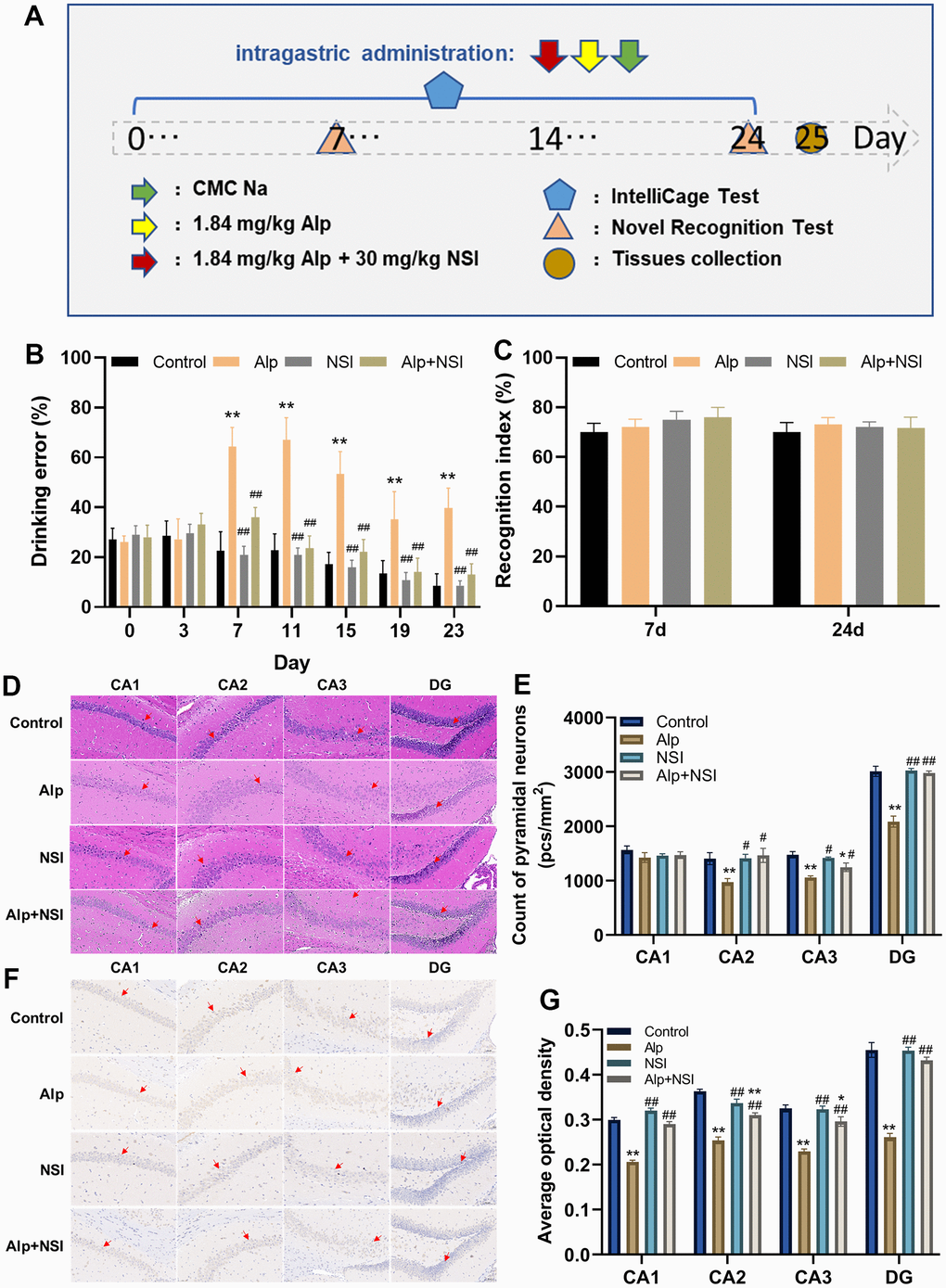 In this ICS test, the drinking error of mice in the Alp group increased significantly from day 5 compared to the control group (p < 0.05), although it narrowed gradually (Figure 6B). For the NSI group and the Alp + NSI group, there was no significant difference in the drinking error compared to the control group, but it was significantly reduced from day 7 compared to the Alp group (p < 0.01), further indicating that the memory consolidation process in mice was barriered after repeated administration of Alp. Since memory consolidation was impaired, whether repeated administration of Alp affects their learning and acquisition processes needs to be elucidated. Therefore, the learning ability was tested after the re-administration of Alp by NOR test. Interestingly, the results of both the 7th and 24th experiments did not show any significant difference in the NOR index in the Alp group, the NSI group and Alp + NSI group compared to the control group (Figure 6C). Hence, it was speculated that the learning ability of mice is not affected during the 24 days of repeated administration of Alp.