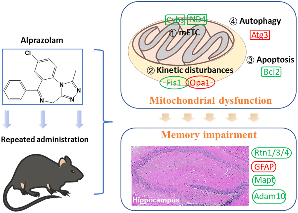 Repeated administration of Alp causes attenuation of hippocampus-dependent memory consolidation rather than memory acquisition, and this adverse effect mediated by mitochondrial dysfunction. Nevertheless, the neurotoxicity can be prevented by mitochondrial protectors, which provides new ideas for the clinical administration of Alp (Figure 7).