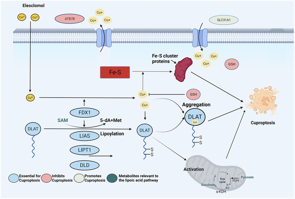 Numerous studies have investigated various forms of regulated cell death that shape the biological and therapeutic response to ESCC, including ferroptosis and macrophages. Excitingly, a recent study by Tsvetkov and colleagues published in the journal Science confirmed that copper-induced regulated cell death, also known as cuproptosis, is a newly discovered form of regulated cell death that is distinct from apoptosis, sepsis, and iron death [7]. Cuproptosis is intricately linked to the mitochondria, and the underlying mechanism entails the direct interaction of copper with lipidized constituents in the tricarboxylic acid cycle (Figure 1) [8]. As a result of this interaction, fatty acylated protein aggregation occurs, along with iron-sulfur cluster protein loss. This cause stress and protein toxicity, which eventually results in cell death.
