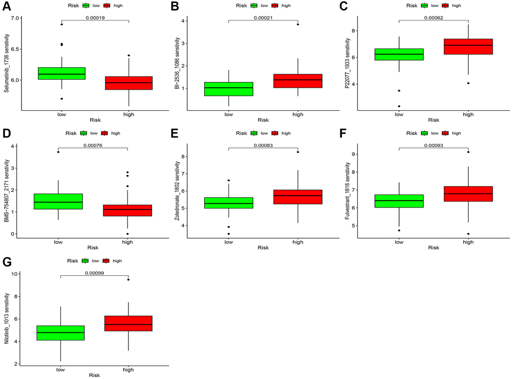 We employed multiple approaches to assess immune infiltration in the high- and low-risk groups (Figure 9A). We investigated the association between the risk score for ESCC and immune-related activities and identified notable variations in the risk score for parainflammation, APC coinhibition, and CCR (Figure 9B, 9C). We also investigated the correlation between the CuRLs and immune pathways and found that LINC00601 was significantly associated with multiple immune pathways (Figure 9D). In fact, TIDE scores were significantly higher in the low-risk group than in the high-risk group in the TCGA cohort (p < 0.05), suggesting that patients in the high-risk group were more likely to benefit from immunotherapy. This was validated in the GSE53625 cohort (Figure 9E, 9F). Potential treatment options were predicted by analyzing 198 commonly used chemotherapeutic agents, and we found differences for 66 drugs (p < 0.05). Among them, seven drugs (Selumetinib, BI-2536, P22077, BMS-754807, Zoledronate, Fulvestrant, and Nilotinib) had significant associations (p < 0.01) (Figure 10A–10G). Sensitivity analysis showed greater sensitivity to Selumetinib and BMS-754807 in the low-risk group than in the high-risk group. These findings suggest that risk assessment can guide personalized drug therapy for ESCC patients (Supplementary Tables 3–5).