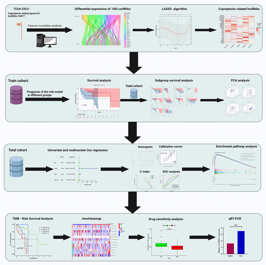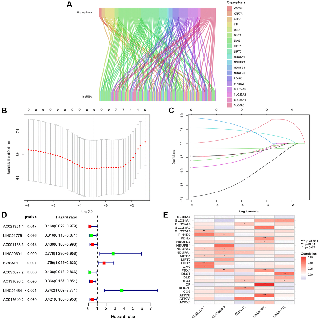 The expression of 25 cuproptosis-related genes (ATOX1, ATP7A, ATP7B, CCS, COX7B, CP, DLAT, DLD, DLST, FDX1, GCSH, LIAS, LIPT1, LIPT2, MITD1, NDUFA1, NDUFA2, NDUFB1, NDUFB2, PDHX, PIH1D2, SLC22A5, SLC23A2, SLC31A1, SLC6A3) was obtained by previous studies. To identify CuRLs clearly associated with ESCC (|Pearson R| > 0.4, p < 0.001), Pearson-related analysis was performed [11], CuRLs were screened for prognosis-related lncRNAs (p < 0.05) using one-way Cox regression analysis [12], and a forest plot was drawn.