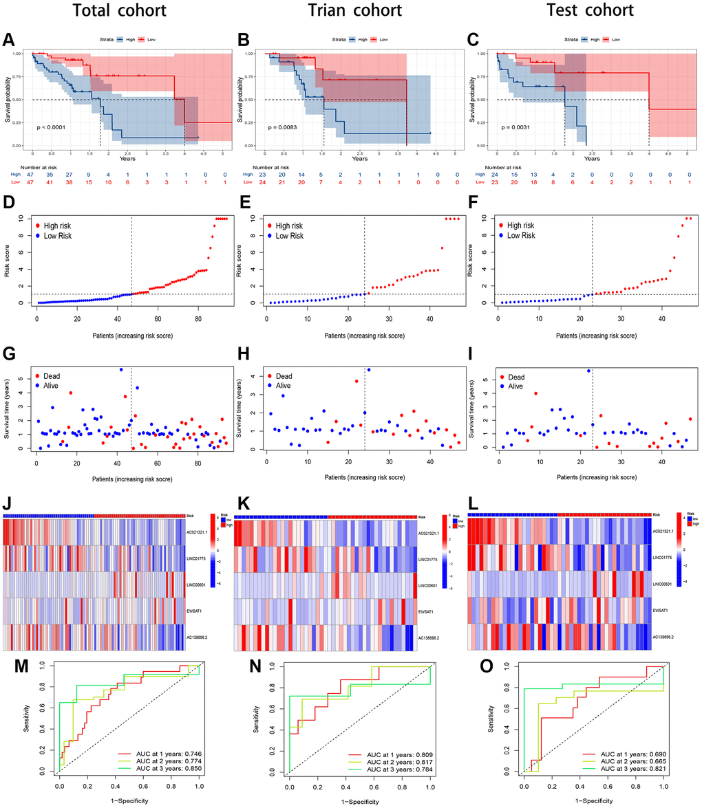 The regression coefficients of the 5 lncRNAs were obtained by multifactorial Cox regression of the training group in the previous step, and each patient’s risk score was calculated. Based on the median risk score, the patients were divided into two groups: a low-risk group and a high-risk group. We performed KM survival analysis for both groups and obtained survival curves showing that the high-risk group had a significantly lower survival rate than the low-risk group (Figure 4B). The feasibility of the risk score was verified using the ROC curve, with AUC values of 0.809, 0.817, and 0.784 for 1, 2, and 3 years, respectively (Figure 4N). The scatter plots and heatmaps for the training set demonstrated that the low-risk group had significantly longer survival times than the high-risk group in the risk assessment (Figure 4E, 4H, 4K). We used the same methodology for the total and test groups and performed KM survival analysis. The results showed that the survival rate was significantly better in the low-risk group than in the high-risk group (Figure 4A, 4C). Scatter plots and heatmaps were used to assess the risk in both groups and revealed a significant difference in survival time between the low-risk and high-risk groups (Figure 4D, 4G, 4J, 4F, 4I, 4L). The AUC values for the ROC curves were 0.746, 0.774, and 0.850 at 1, 2, and 3 years, respectively, for the total cohort and 0.690, 0.665, and 0.821 for the test group (Figure 4M, 4O). The CuRL risk assessment model showed superior prognostic ability in all groups.