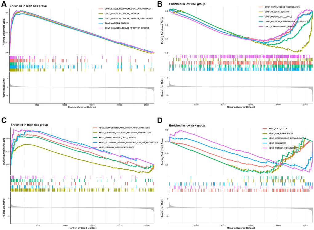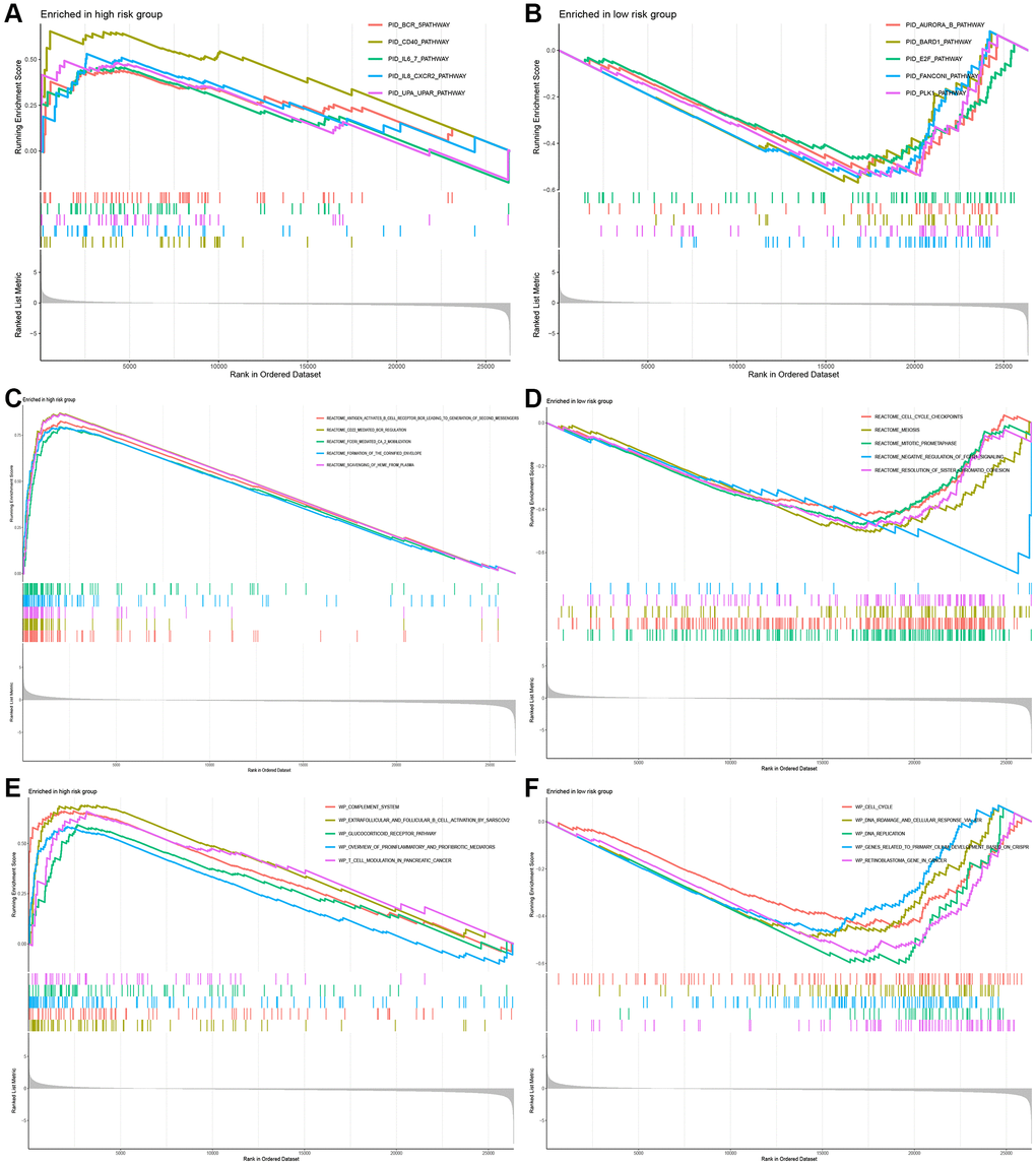 To further illustrate the association of the five CuRLs with biological processes, GSEA was performed, which yielded 332 GO functions, 28 KEGG pathways, 27 PID pathways, 153 REACTOME-related pathways and 68 WP-related pathways. GO analysis revealed that the major pathways for the lncRNAs were associated with BP terms such as cell receptor signaling, CC terms such as immunoglobulin complexes and circulating immunoglobulin complexes, and MF terms such as immunoglobulin receptor binding and antigen binding (Figure 6A, 6B). The cytokine receptor interaction pathway ranked as the top KEGG signaling pathway in our analysis, followed by hematopoietic stem cells, complement and coagulation system, primary immunodeficiency, and intestinal immune network for IGA production (Figure 6C, 6D). The top five PID signaling pathways were the CD40 pathway, IL8_CXCR2 pathway, TOLL_ENDOGENOUS pathway, BCR_5 pathway and PLK1_pathway (Figure 7A, 7B). The REACTOME pathways and top five WP signaling pathways are shown in Figure 7C–7F.