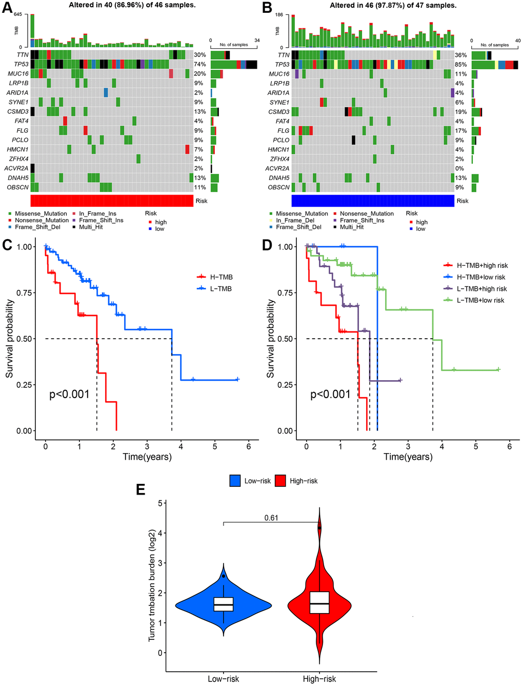 The somatic mutation database was downloaded to investigate the mutation rates in the high- and low-risk groups from the TCGA database. The 10 genes with the highest mutation rates were TP53, TTN, CSMD3, MUC16, SYNE1, LRP1B, PCLO, FLG, HMCN1, and SYNE1. Among them, TP53, TTN, CSMD3, MUC16 and SYNE1 were the genes most commonly mutated in ESCC (Figure 8A, 8B). Furthermore, the high-risk group had a significantly higher TMB than the low-risk group (p < 0.05) (Figure 8C, 8D), and patients with high TMB had worse prognoses according to the KM curve analysis (Figure 8E).