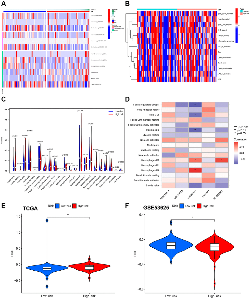 To further validate the prognostic potential of the CuRL model, we performed in vitro experiments to explore the expression trends of different CuRLs. Our team measured the expression levels of EWSAT1, AC138696.2, AC021321.1, LINC00601, and LINC01775 in KYSE-30, KYSE-410, and KYSE-520 cancer cell lines and in patient cancer tissues and paracancerous tissues using RT-qPCR. The results showed an overall increasing trend in the expression of these lncRNAs (Supplementary Figure 6A–6E), except for LINC01775, which showed no differential expression (Supplementary Figure 7A–7E). The RT-qPCR results are for reference only. Overall, our experimental results support our model.
