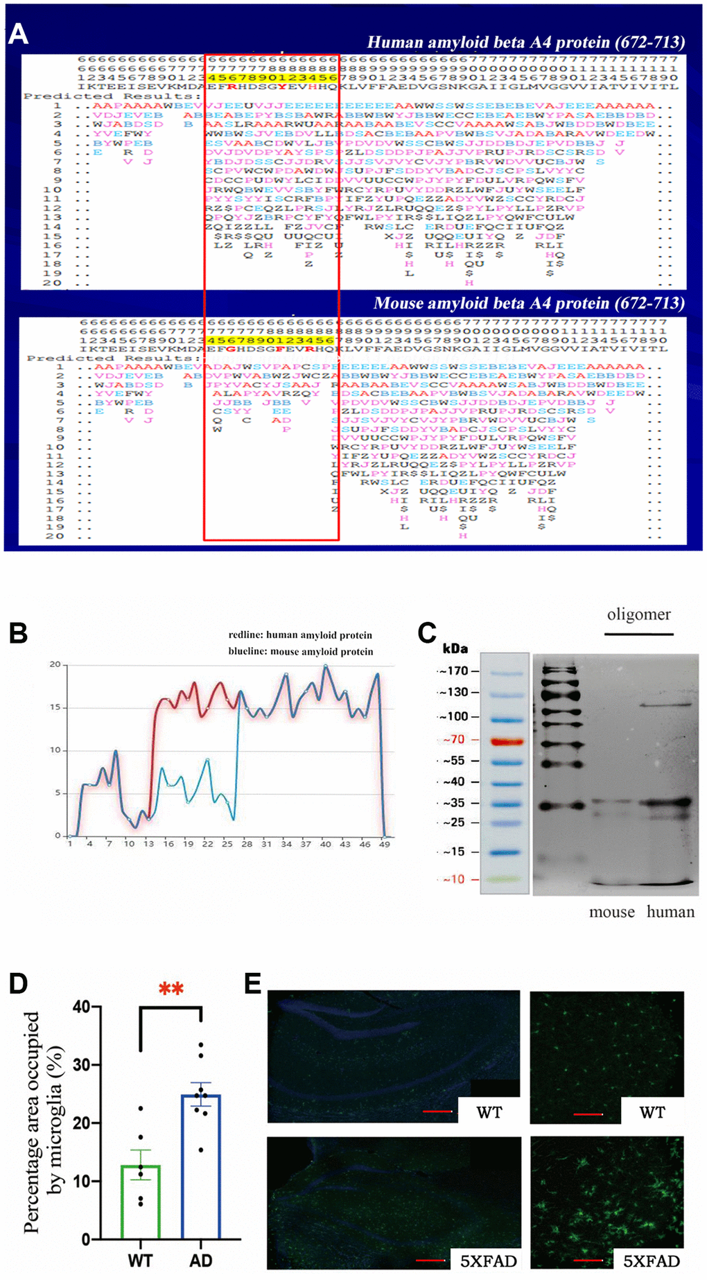 We used the PFSC method to predict the protein conformation fingerprint change matrix and the protein conformation fingerprint change curve of the amino acid sequence of amyloid protein in mice and humans. The results are shown in Figure 1A and 1B. First, we utilized the PFSC approach to simulate all feasible polypeptide configurations based on the Aβ sequence of 42 amino acids in humans and mice. Evidently, a higher number of conformational possibilities leads to increase the variability and instability at this site, thereby facilitating polymer formation. It is evident that mouse Aβ displays superior stability compared to its human counterpart, which may account for the reduced propensity towards polymerization. These results suggest that the probability of amyloid polymerization is different in mice and humans. To confirm these results, we used the two amino acid sequences to synthesize amyloid proteins, oligomerized them under the same conditions, and then found that murine Aβ formed fewer oligomers (Figure 1C). These results further explained why normal mice have fewer plaques, since murine Aβ does not polymerize easily. We preliminarily concluded that the different amino acid sequences of Aβ in mice decreased the degree of polymerization. If the mice were given human’s gene, they would develop plaques in their brains and exhibit Alzheimer’s-related symptoms.