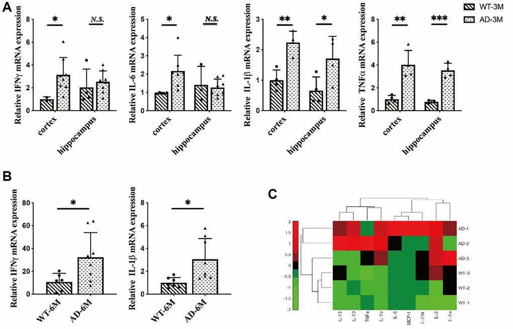 A number of recent studies have demonstrated that peripheral inflammatory conditions can affect the microglial response through neuroimmune communication. If microglia have been activated in AD, being stimulated by peripheral proinflammatory cytokines can amplify this overexpression [25]. To investigate the peripheral inflammatory response in 5XFAD mice serum inflammatory cytokines were measured in 8-month-old mice. The results indicated that inflammatory cytokines were highly secreted in 5XFAD mice (Figure 2C) and verified AD disease symptoms.