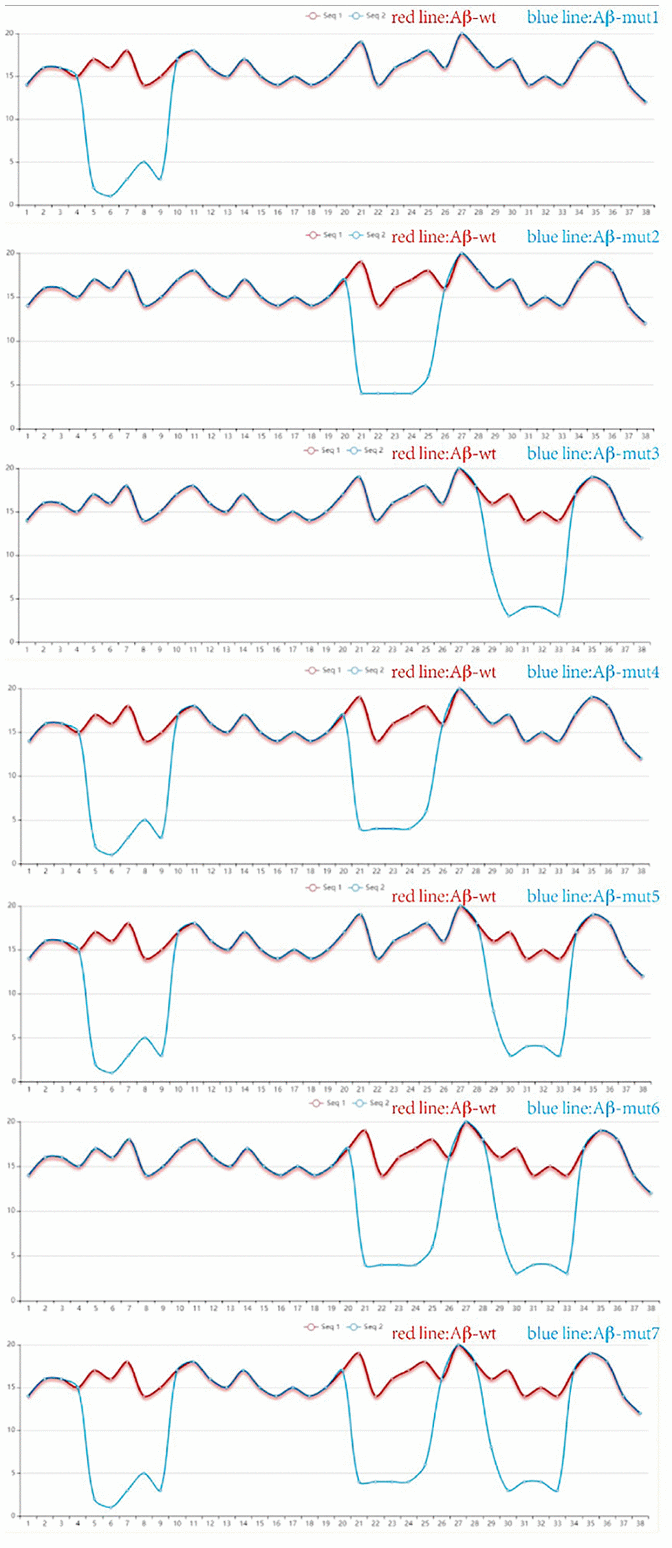 Site-directed antibodies that modulate the conformation of the Aβ peptide are the theoretical basis of the immunological approach for the treatment of AD. Changes of the amino acid sequence can directly prevent and reverse protein aggregation in conformational disorders [28]. The aim of this study is to explore the relationship between amino acid sequences, amyloid peptide conformation/aggregation and the signaling cascades responsible for neurotoxicity. Using the PFSC method, we found some certain sites were closely related to polymerization of Aβ42 in humans and amino acid substitutions could reduce the likelihood of Aβ aggregation. The vector characteristics of PFSC in the horizontal and vertical directions were significantly different and these sites were found to be key positions in protein conformation modulation. The way we changed these proteins is shown in Table 1. Protein conformational fingerprint change curves for the unmutated and seven mutated amino acid sequences are shown in Figure 4. Here, we defined the backbone of five amino acid residues was identified as a universal folder. As the X-axis showed, the computational sites were ordered from 1 to 38 in accordance with the amino acid arrangement. The vertical axis of the digital represented all possible folding shapes of local folding variations for all permutation of five amino acids. The results indicated that altering the amino acid sequence from Gly to Ile, Ala and Pro, was an effective strategy for improving the stability of protein structure and reducing the likelihood of forming polymers.
