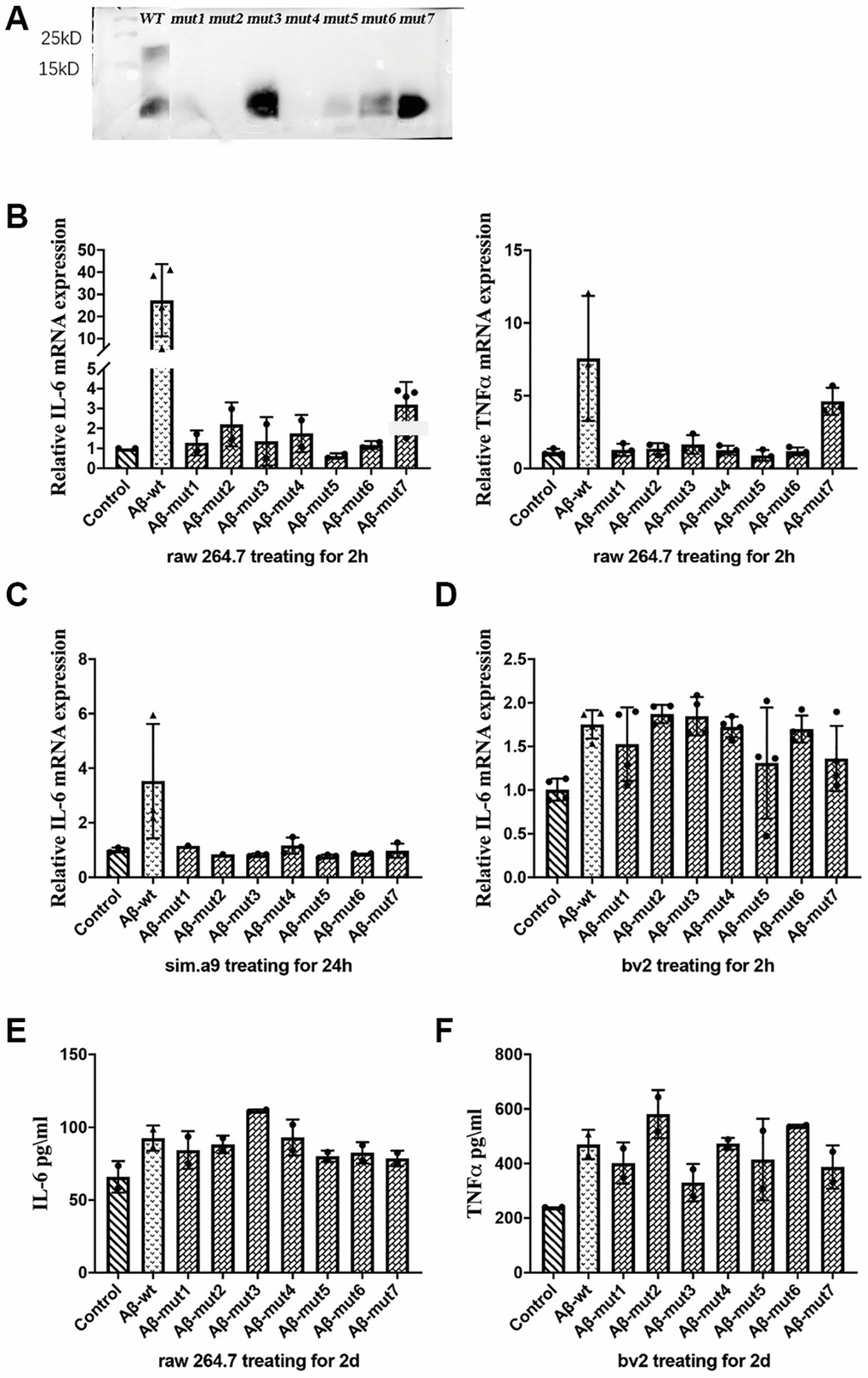 Nonmutated and mutated Aβ oligomers were used to stimulate cells in vitro. The unmutated oligomeric form induced a more robust inflammatory response, whereas the mutated oligomeric and fibrillar conformations were less potent triggers for RAW 264.7 cells. The expression of IL-6 and TNFα was not significantly increased after stimulation with the mutant oligomers (Figure 5B). We also observed a decreased inflammatory response in a microglial cell line (SIM-A9) from C57BL/6 mice (Figure 5C). We confirmed these results in the BV2 murine microglial cell line studies (Figure 5D). After analyzing the secretion of inflammatory factors by stimulated cells, we measured the concentration of IL-6 in the culture medium of RAW 264.7 cells and TNFα in the culture medium with an ELISA kit and obtained consistent results (Figure 5E and 5F).