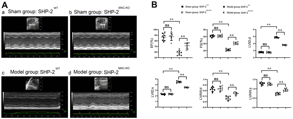 In this study, the ultrasound detection assessed whether myeloid-specific knockout of SHP2 has improved cardiac function in mice with myocardial infarction. The results showed that myeloid-specific knockout of SHP2 could increase ejection fraction (EF), shortening fraction (FS), diastolic left anterior wall thickness (LVAW; d) and systolic left anterior wall thickness (LVAW; s), and decrease left ventricular diastolic diameter (LVID; d) and left ventricular systolic diameter (LVID; s). It was suggested that myeloid-specific knockout of SHP2 can improve cardiac function in mice with myocardial infarction.