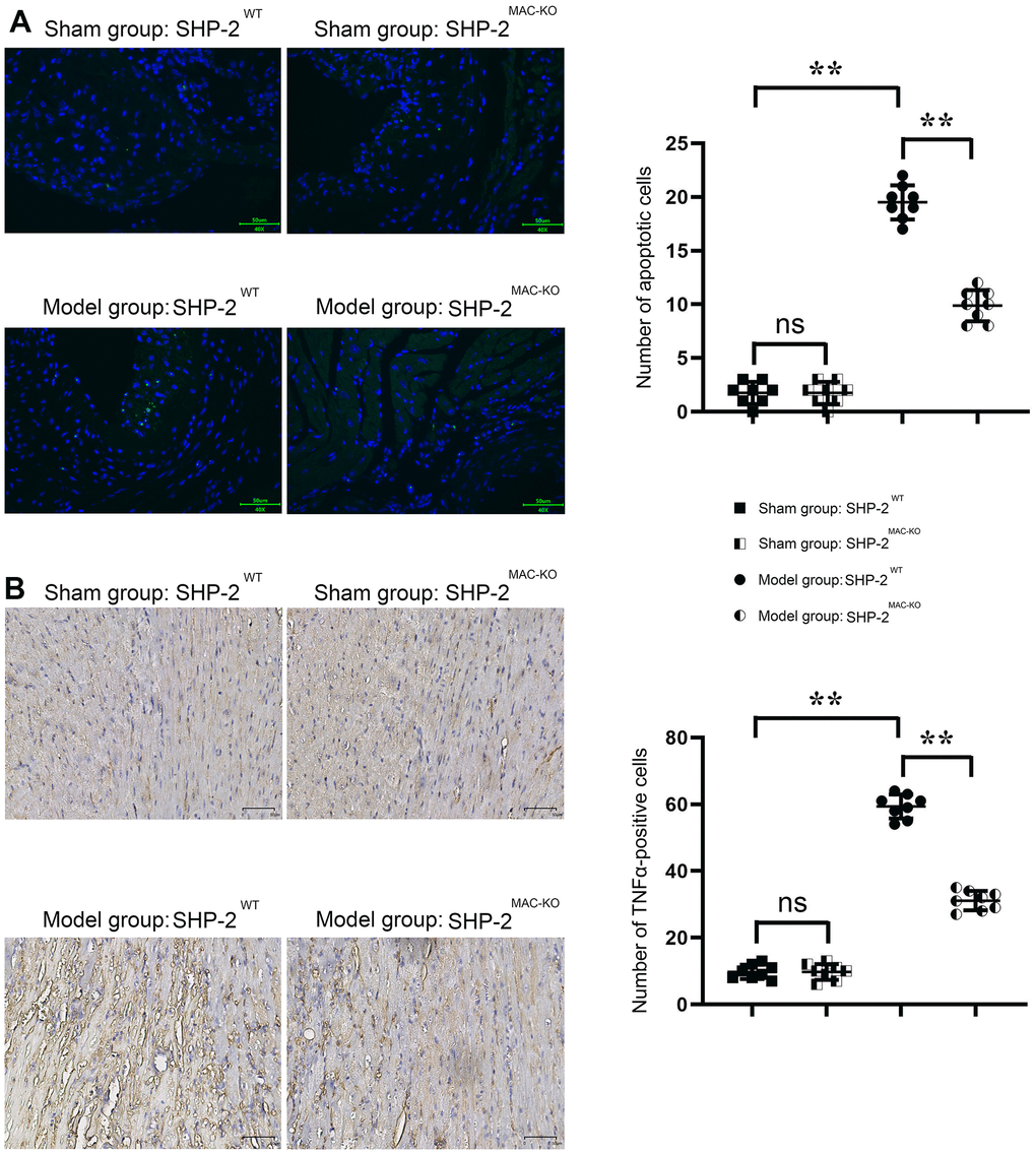 SHP2MAC-KO could reduce the number of apoptosis and inflammatory cell infiltration in mouse myocardial infarction