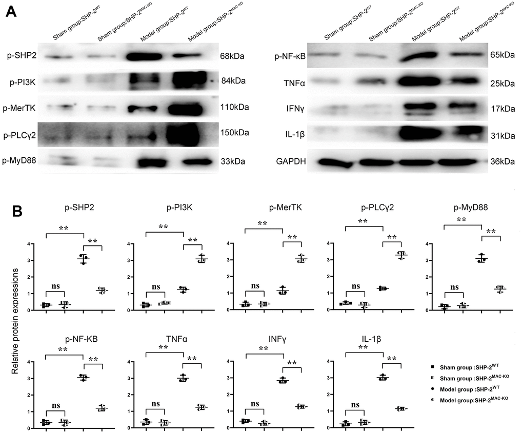 5ul of phenylmethanesulfonyl fluoride (PMSF) and 5ul of phosphatase inhibitor cocktail were added to 490ul RIPA lysate to extract cell protein, and the sample protein concentration was measured by using BCA protein quantification kit. Then the gels for separation and concentration of protein should be prepared. The 5×SDS-PAGE Loading Buffer was added to the protein sample to dilute it into the sample containing 1×SDS-PAGE Loading Buffer. 30ug of protein sample was added through the well, and the maker was added into the first well on both sides, and the difference in sample volume can be made up with 1×SDS loading buffer. After switching on the power, 80V, 30 minutes to reach the interface of gels for separation, then set the voltage to 120V, 1.5 hours to reach the bottom of the gels for separation to stop electrophoresis. Then the membrane was transferred, and put in the TBST buffer containing 5% skim milk powder, blocked for 2 h. Primary antibodies p-SHP2(Abcam, ab62322, 1:1000), p-PI3K (CellSignaling, 17366, 1:1000), p-MerTK (CellSignaling, 44463,1:1000), p-PLCγ2 (CellSignaling, 3871, 1:1000), p-Myd88 (CellSignaling, 17366, 1:1000), p-NF-κB (CellSignaling, 3303,1:1000), TNFα (CellSignaling, 11948, 1:1000), IFNγ (CellSignaling, 8455, 1:1000), IL-1β (CellSignaling, 12703, 1:1000), and GADPH (CellSignaling, 5174, 1:1000) were added, and were incubated at room temperature for 1 hour, then incubated at 4° C overnight. After washing 3 times with TBST for 5 min each, the secondary anti-goat anti-rabbit IgG H&L (Abcam, ab6702, 1:5000) was added and incubated for 2 h, then washed 3 times with TBST for 5 min each. The color was exposed and developed, and then the result band was analyzed.