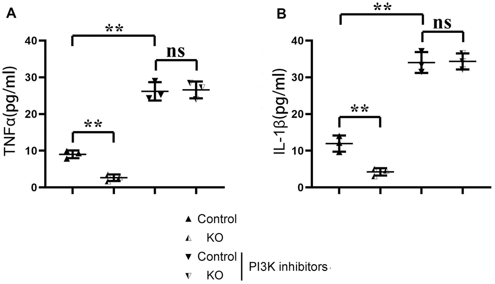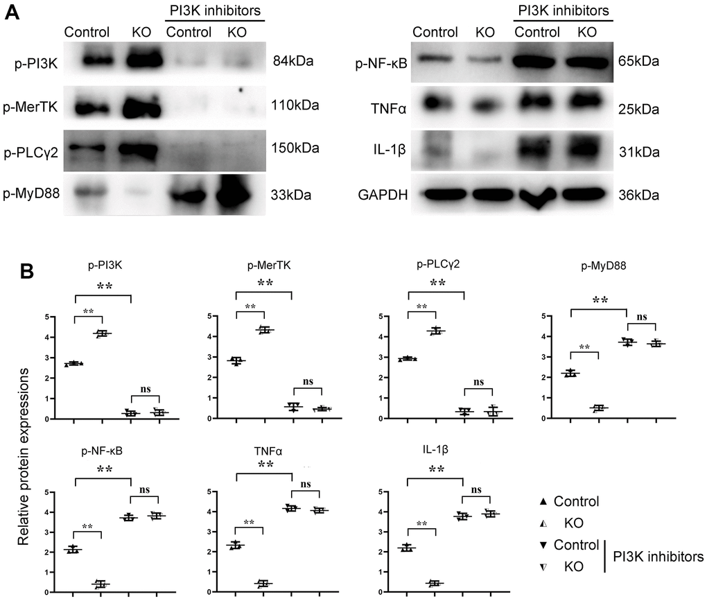 The results of Western blotting showed that there was no significant difference in p-PI3K, p-MerTK, p-PLCγ2, p-MyD88, p-NF-κB, TNFα, IFNγ, and IL-1β in SHP2MAC-KO in the sham group, and the expression of SHP2 was significantly reduced. Compared with Model: SHP2WT group, the expression of p-PI3K, p-MerTK and p-PLCγ2 significantly increased in SHP2MAC-KO group, whereas the expression of p-SHP2, p-MyD88, p-NF-κB, TNFα, IFNγ, and IL-1β decreased significantly (Figure 4). These results manifested that myeloid-specific knockout of SHP2 mediated the PI3K/PLCγ signaling pathway to decrease the expression of inflammatory factors and promote the expression of protein related to phagocytic activity. The results of Western blotting in vitro showed that the expression of p-PI3K, p-MerTK and p-PLCγ2 in KO group was significantly higher than that in control group. The expression of p-MyD88, p-NF-κB, TNFα, IFNγ and IL-1β significantly decreased to the control group. However, there was no significant difference in the expression of these proteins between the control +PI3K inhibitor group and the KO+PI3K inhibitor group. Compared with the control group, the expression of p-PI3K, p-MerTK, p-PLCγ2 and p-MyD88, p-NF-κB, TNFα and IL-1β were significantly increased in the control+PI3K inhibitor group (Figure 5). It was verified that the mediation of PI3K/PLCγ signaling pathway by myeloid specific knockout SHP2 affected the expression of inflammatory factors and proteins related to phagocytic activity.