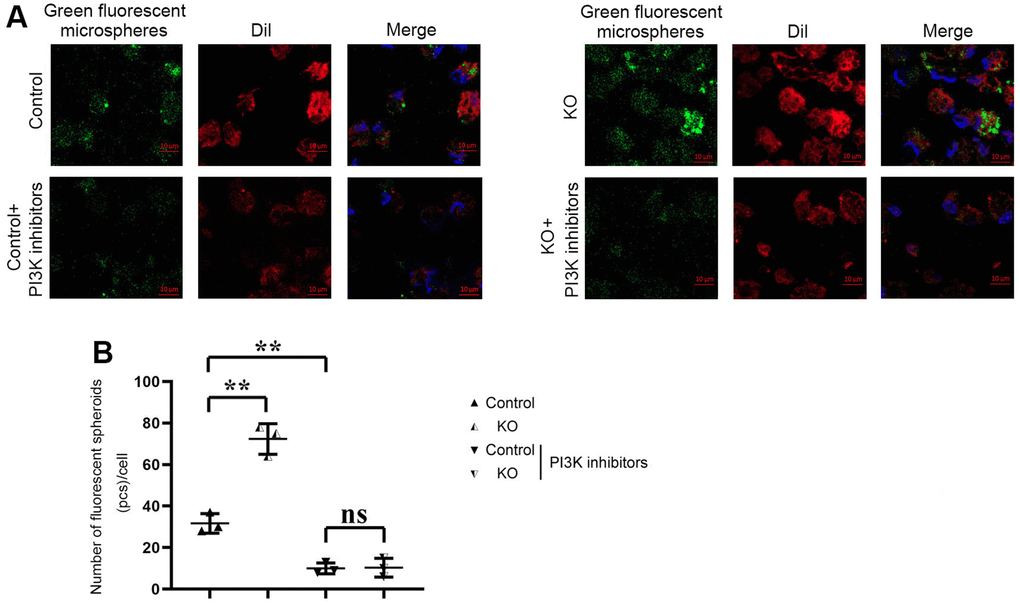 The phagocytosis of macrophages in each group was detected by Phagocytosis Assay with Fluorescent Microspheres. DiI, namely DiIC18(3) with the full name 1,1’-dioctadecyl-3,3,3’,3’-tetramethylindocarbocyanine perchlorate, is one of the most commonly used cell membrane fluorescent probes, showing orange-red fluorescence. DiI is a lipophilic dye that can diffuse laterally after entering the cell membrane and gradually stain the entire cell membrane. The results showed that the number of green fluorescent microspheres phagocytosed by macrophages in KO group was significantly higher than that in control group. Compared with the control group, the number of fluorescent spheroids in the control+PI3K inhibitor group was significantly reduced. However, there was no big difference in the number of green fluorescent microspheres phagocytosed by macrophages between control+PI3K inhibitor group and KO+PI3K inhibitor group. It was demonstrated that myeloid-specific knockdown of SHP2 could mediate PI3K/PLCγ signaling pathway to enhance phagocytic activity of macrophages (Figure 6).