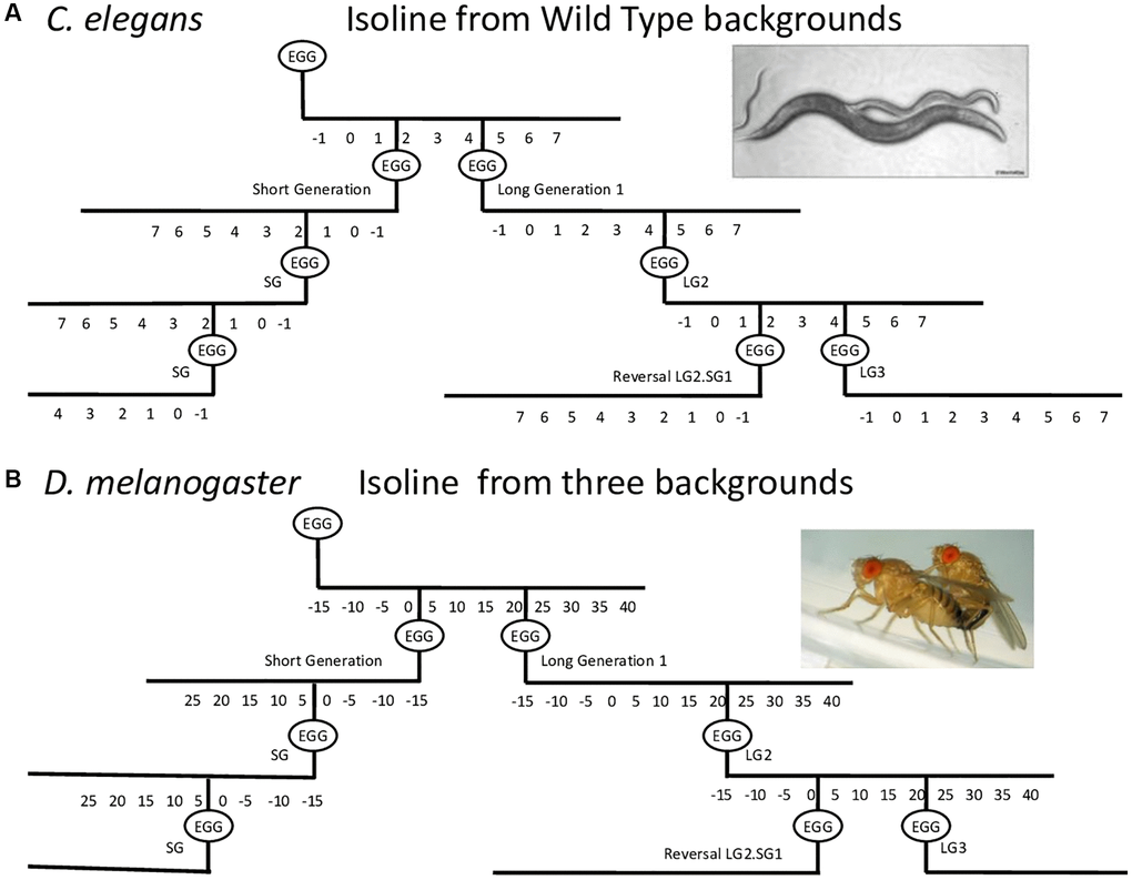 Interestingly, while a number of studies have investigated the effects of advanced parental age on the lifespan of D. melanogaster ([16], reviewed by [21]), little work was published on the effect of parental age in the nematode Caenorhabditis elegans, a common model organism for aging studies [22–24]. Two recent articles have been published on the subject, addressing both the effect of old parental age on progeny longevity, and showing that one day old or three day old hermaphrodites produce progeny with identical life-span [25, 26]. Travers et al. also addressed the cumulative impact of advanced parental age on progeny, and showed that the ‘reversal effect’ observed by Lansing, was present in the nematode. We decided to investigate parental age impact on the lifespan of their progeny on selected genomes of flies and worms to gain insights on the molecular mechanisms at work.