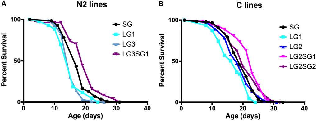The experimental setup for testing the parental age effect in C. elegans is shown in Figure 1A. We choose to maintain the lines with hermaphrodites and males, to enhance their reproductive capabilities. The average parental age for lines issued from young parents (SG) and older parents (LG) was 48 ± 4 h and 96 ± 12 h, respectively. We note that after five LG, the number of progeny was too small for statistical evaluation. Figure 2 shows representative data obtained with N2 and C lines. For both genetic backgrounds, the mean lifespan of the LG lines was significantly shorter than that of SG lines. For example, the mean lifespan of N2 hermaphrodites was 16.2 ± 0.4 days and 17.5 ± 0.4 days for LG3 and SG5, respectively (p = 0.001, Figure 2A), and the mean lifespan of C hermaphrodites was 16.7 ± 0.7 days and 19.3 ± 0.3 days for LG1 and SG2, respectively (p = 0.001, Figure 2B). Overall, the lifespans of LG lines were 4–16% shorter than those of SG lines (Table 1). We observed that the detrimental effect was observed after three successive generations, but not amplified. We conclude that there is no cumulative effect over generations and that one generation is sufficient to observe a significant loss of fitness.