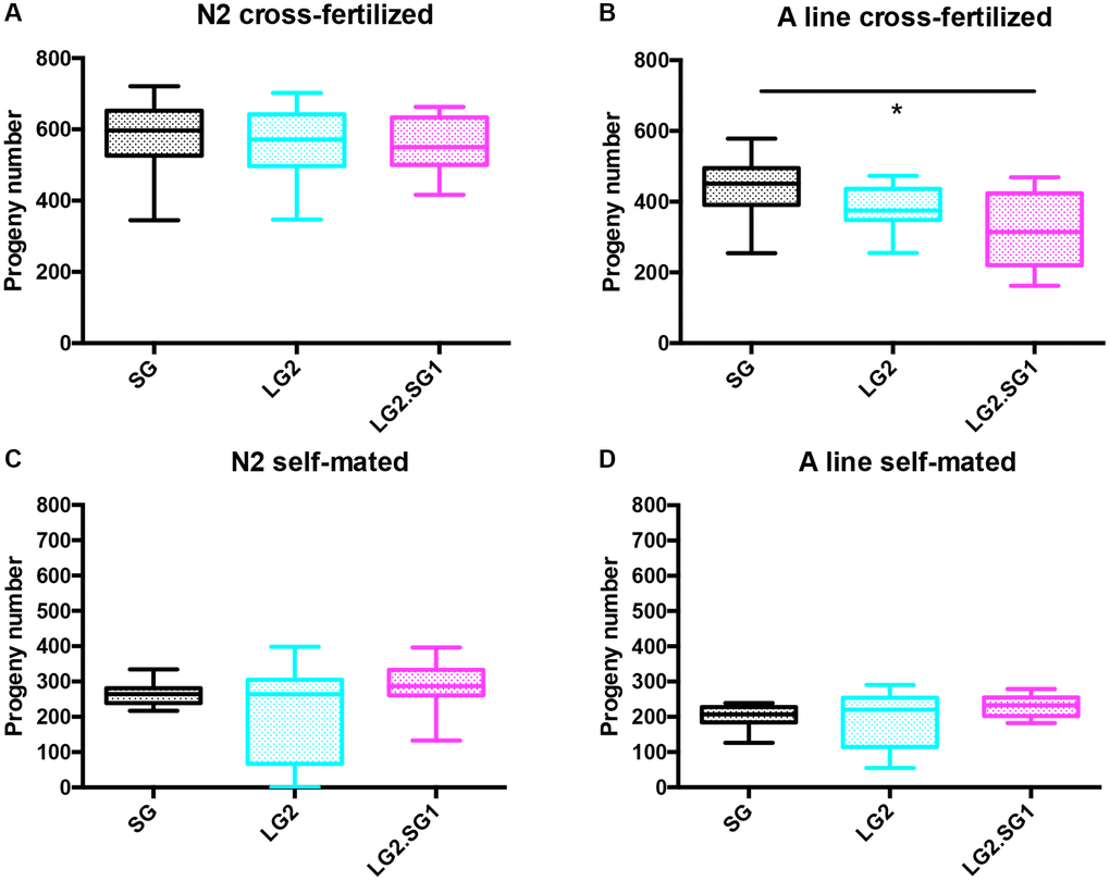 We also found that the effects of parental age on fecundity in C. elegans progeny are affected by the propagation strategy (i.e., self-fertilization vs. mating with males). Beguet et al. reported a significant decrease in the fecundity of C. elegans progeny from older compared with younger self-fertilized parents, and the effect was reversible [22, 23]. Although we observed a similar trend with self-fertilized animals, the difference between the number of progeny in LG and SG lines was not statistically significant. However, LG.SG lines produced a larger number of progeny than either LG or SG lines. Interestingly, the opposite phenotype was observed for the reversal lines of cross-fertilized hermaphrodites in two backgrounds, i.e., the number of progeny of LG.SG lines was smaller than that of the SG or LG lines. We speculate that this could be linked to reduced fertility observed in the second part of the reproductive life of the LG.SG lines compared with the SG and LG lines. This result may reflect oocyte frailty that can only be detected when reproduction is achieved when hermaphrodites mate with males which allows them to produce large quantity of oocytes. A more detailed analysis of the physiology of gonads in these lines will help understand the mechanisms at stake.