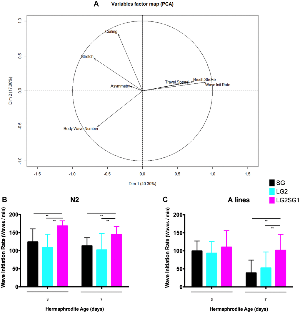 To assess whether parental age affects other aspects of the physiology of C. elegans, we examined locomotion as a marker of overall health. For this, we used the CeLesT computational program [31, 32] to measure the animals’ capacity to swim continuously over a defined period of time. Consistent with previous data [31], we observed age associated alterations in several swimming parameters. PCA analysis of data from N2 lines showed that travel speed, brush stroke, and wave initiation rate decreased with age, while asymmetry and stretch and curling rates increased (Figure 4A). Of the parameters analyzed, we identified wave initiation rate as the best discriminant to investigate the effects of generational history (SG4, LG2, and LG2.SG1) on locomotor behavior. We found little to no difference in the wave initiation rate between progeny derived from cross-fertilized or self-fertilized hermaphrodites for the different lines analyzed (data not shown). However, we consistently observed significantly higher wave initiation rates in the reversal lines compared with either the SG or LG lines. For example, 3-day-old N2 LG2.SG1 hermaphrodites showed a rate of 168 ± 14 waves/min compared with 124 ± 36 and 108 ± 37 waves/min for SG4 and LG2 animals, respectively (Figure 4B). Similarly, on the A background, 7-day-old LG2.SG1 animals showed a mean wave initiation rate of 101 ± 44 compared with 38 ± 35 and 52 ± 44 waves/min for SG4 and LG2 animals (Figure 4C). However, there was no significant difference between the wave initiation rates of SG and LG animals of either genetic background (Figure 4B, 4C).