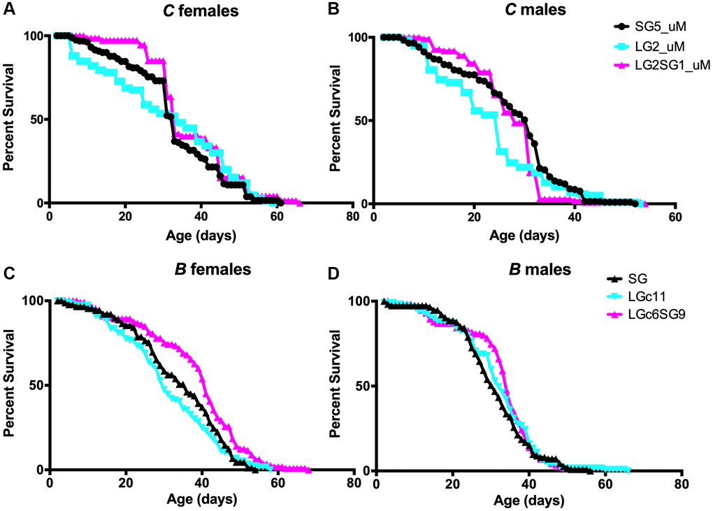 The reversibility of the parental age effect was also observed in the B background; however, the mean lifespan difference between animals maintained on LG and reversed from LG to SG was significant for females (LGc11, 31.1 ± 1.1 days and LGc6.SG9, 38.5 ± 1.2 days; p < 0.001) but not for males (LGc11, 31.5 ± 1.0 days and LGc6.SG9 32.7 ± 0.9 days; Figure 5A, 5B and Table 2). The mean lifespan of B LGc6.SG9 females was not significantly different from that of the SG22 line (38.5 ± 1.2 days and 33.8 ± 1.3 days, respectively; p = 0.29) (Figure 5C, 5D and Table 2). Interestingly, we were able to reproduce the reversal effect in one short generation: both females and males of C line displayed similar or longer lifespans compared to the SG lines (Figure 5A, 5B).