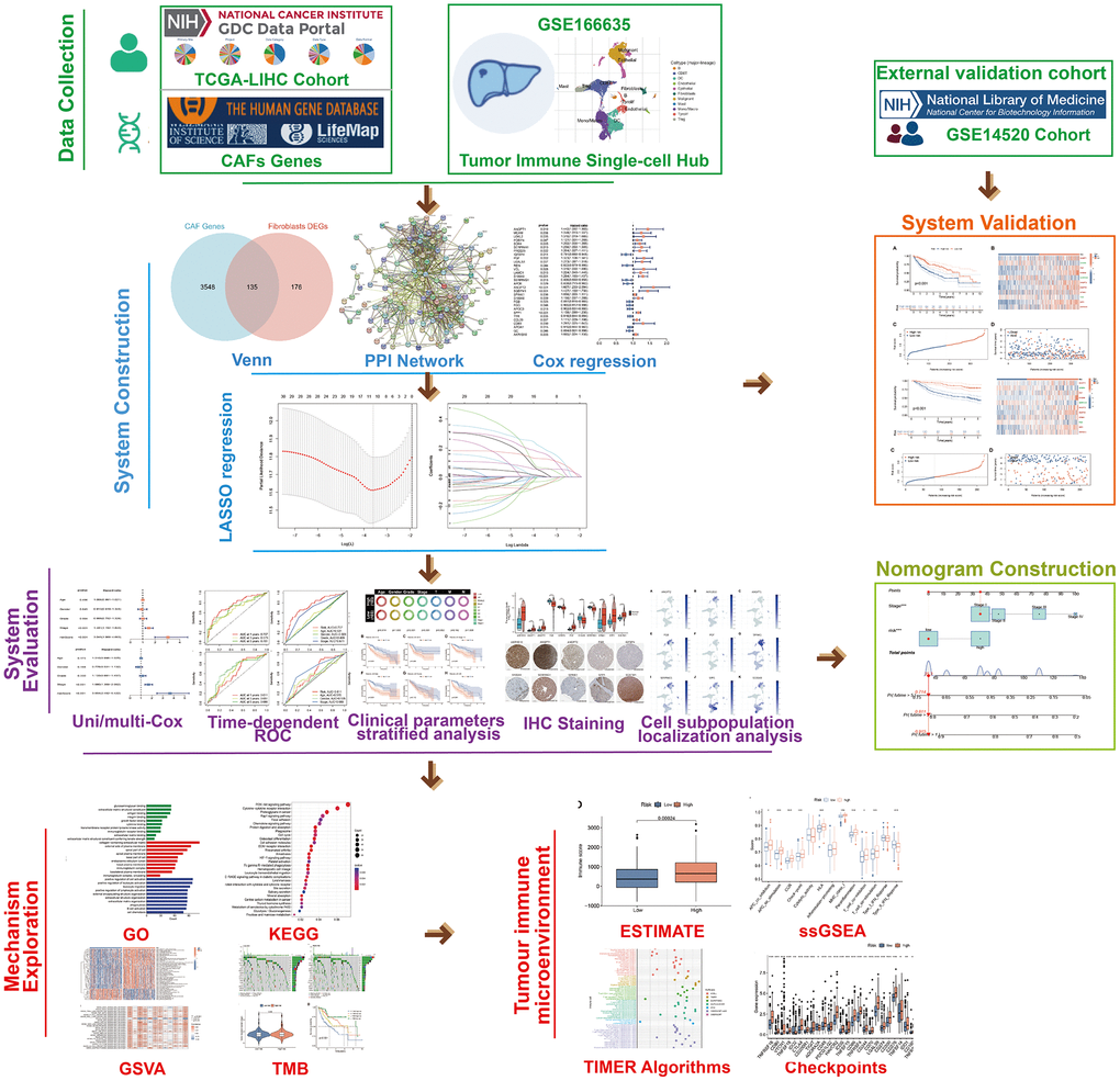 The flow chart of the study is presented in Figure 1. The transcriptomic and clinical data for individuals with HCC were downloaded from The Cancer Genome Atlas (TCGA) (https://portal.gdc.cancer.gov/repository) repository. The nucleotide variation matrix downloaded from the TCGA-LIHC cohort was collated using Perl scripts (V.5.32.1.1) to generate the tumour mutation burden (TMB) matrix for subsequent analysis. The transcriptomic and clinical parameter data for the HCC cohort GSE14520 were downloaded from the Gene Expression Omnibus (GEO) database (https://www.ncbi.nlm.nih.gov/). Single-cell sequencing data for the GSE166635 cohort were obtained from the Tumor Immune Single-cell Hub (TISCH) database (http://tisch.comp-genomics.org/), wherein annotations referring to the major-lineage entry in the TISCH and the existing classical cell markers were made. Immunohistochemical (IHC) staining images of proteins encoded by CAFRss-related genes ANGPT1, IGFBP4, S100A9, SERPING1, ANGPT2, SQSTM1, SPINK1, FGB, SPP1 and AKR1B10 in HCC tumour tissue were obtained from the Human Protein Atlas V.22.0 (HPA) (https://www.proteinatlas.org) (Supplementary Table 1) [18]. Finally, the set of CAFs-associated genes were obtained from The Human Gene Database (https://www.genecards.org/) [19].