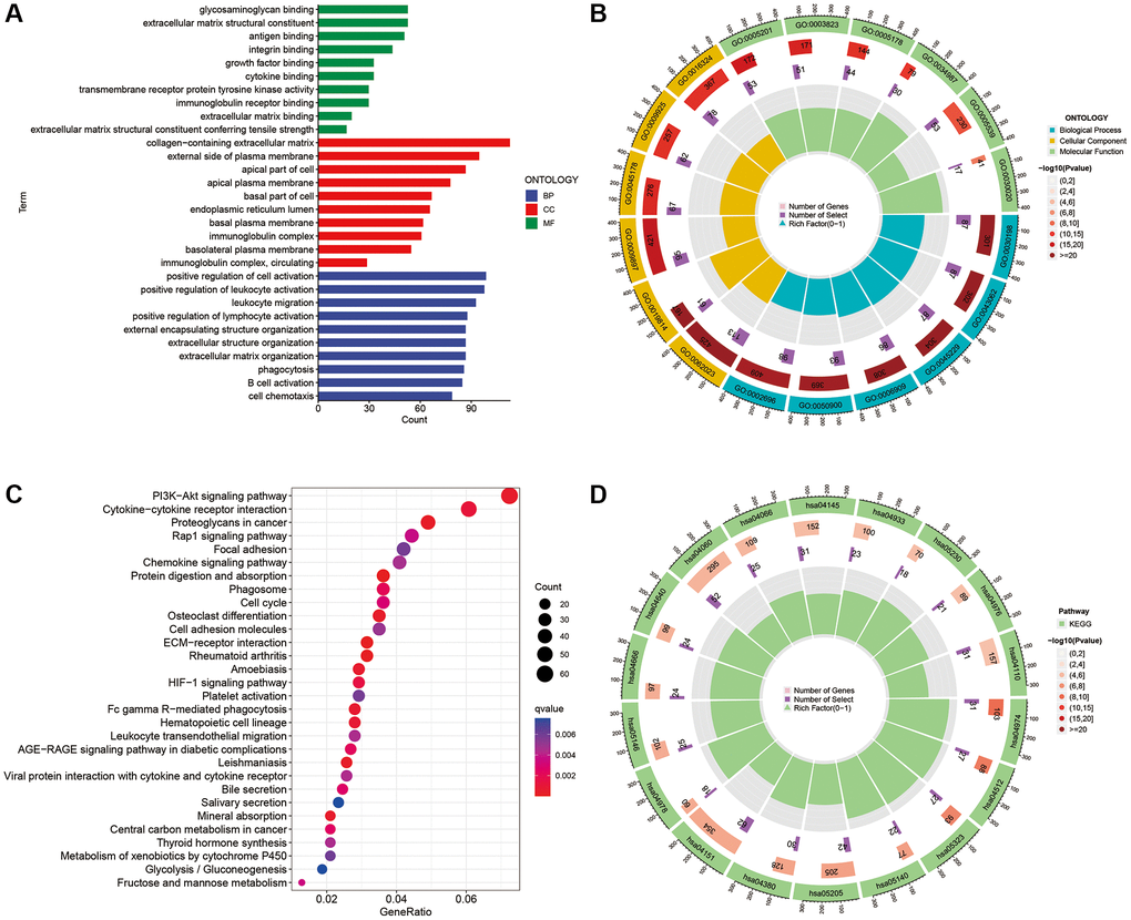 Considering the differences in the enrichment pathways between the different risk subgroups, we identified DEGs between the two risk subgroups and further performed GO and KEGG analyses. GO analysis indicated that the DEGs were mainly enriched in the positive regulation of cell activation, leukocyte activation, leukocyte migration, lymphocyte activation, collagen-containing extracellular matrix, immunoglobulin complex and antigen binding, among others (Figure 10A, 10B). Regarding KEGG, DEGs were mainly enriched in PI3K-Akt signalling pathway, cytokine-cytokine receptor interactions, proteoglycans in cancer, Rap1 signalling pathway, focal adhesion and chemokine signalling pathways (Figure 10C, 10D).