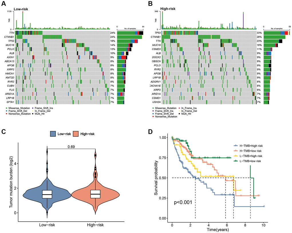 Mutation waterfall plots revealed the top three genes with the highest mutation frequencies in the low-risk subgroup as CTNNB1 (24%), TTN (24%) and TP53 (19%), whereas, in the high-risk group it was TP53 (33%), CTNNB1 (28%) and TTN (23%) (Figure 11A, 11B). K-M curves demonstrated that patients with low TMB had significantly better survival compared to those with high-TMB (Supplementary Figure 2). Although there was no significant difference in TMB levels between the two risk subgroups (Figure 11C), there was a significant difference in survival between the TMB subgroup and the risk subgroup combination (P < 0.001) (Figure 11D), suggesting that the combination of risk score and TMB could provide a better prediction of clinical outcomes for patients.
