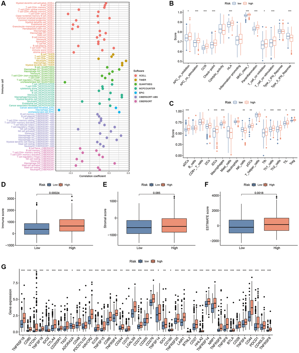 The Estimation of STromal and Immune cells in MAlignant Tumour tissues using Expression data (ESTIMATE) algorithm is commonly employed to estimate the number of infiltrating immune cells and stromal cells in tumour tissues [24]. We utilised the packages ‘ESTIMATE’ and ‘limma’ to estimate the number of immune cells and stromal cells in the tumour tissue of each sample in the TCGA-LIHC cohort to obtain the corresponding scores. Additionally, the R package ‘ggpubr’ was employed to plot differential box plots of immune and stromal scores in the two risk subgroups. Aberrant activation of immune checkpoints inhibits the killing of tumour cells by effector immune cells and promotes immune escape of tumour cells [25]. The differences in the expression of different immune checkpoint-related genes between the two subgroups were analysed.