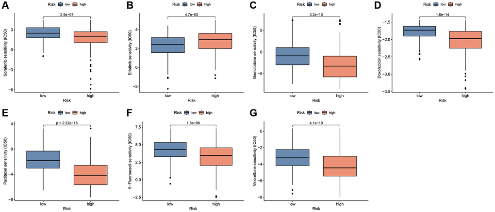 To explore the potential of CAFRss in the personalised treatment of patients with HCC, we analysed the differences in IC50 values for different anti-tumour agents between the two risk subgroups. Notably, with the exception of erlotinib, the IC50 for sorafenib and most chemotherapeutic agents was lower in the high-risk group compared to the low-risk subgroup (Figure 13A–13G). Additionally, the IC50s for the targeted drugs dasatinib, imatinib, lisitinib, sunitinib and ruxolitinib were also significantly lower in the high-risk subgroup (Supplementary Figure 3).