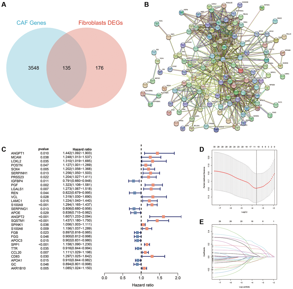 DEGs (fold change >1.5, P < 0.05) between CAFs and other cell types were extracted from single-cell sequencing data from the GSE166635 cohort. Furthermore, the R package ‘VennDiagram’ was used to draw a Venn diagram of DEGs and CAFs-associated genes to identify overlapping CAFs-associated genes. Protein interactions of the intersecting genes were mapped using the STRING platform (https://cn.string-db.org/).