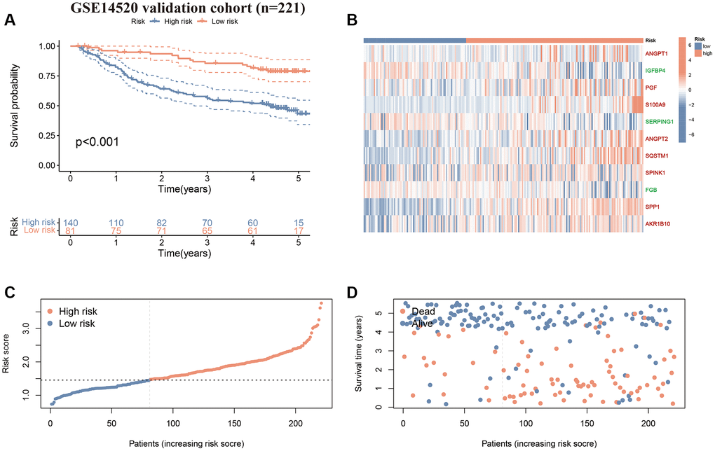 First, we performed survival validation of the CAFRss in the TCGA-LIHC cohort. The K-M curves demonstrated that the low-risk population had significantly better OS than the high-risk subgroup (Figure 5A). The heat map displayed the expression levels of the 11 genes in the CAFRss, where the three protective factors (IGFBP4, SERPING1 and FGB) exhibited lower expression in the high-risk subgroup, while the eight risk factors exhibited higher levels of expression in the high-risk subgroup (Figure 5B). Furthermore, the risk score distribution and survival status maps for the TCGA-LIHC cohort showed an increasing proportion of individuals with mortality status as the high-risk scores rose (Figure 5C, 5D). The results were further validated in the GSE14520 cohort (Figure 6A–6D).