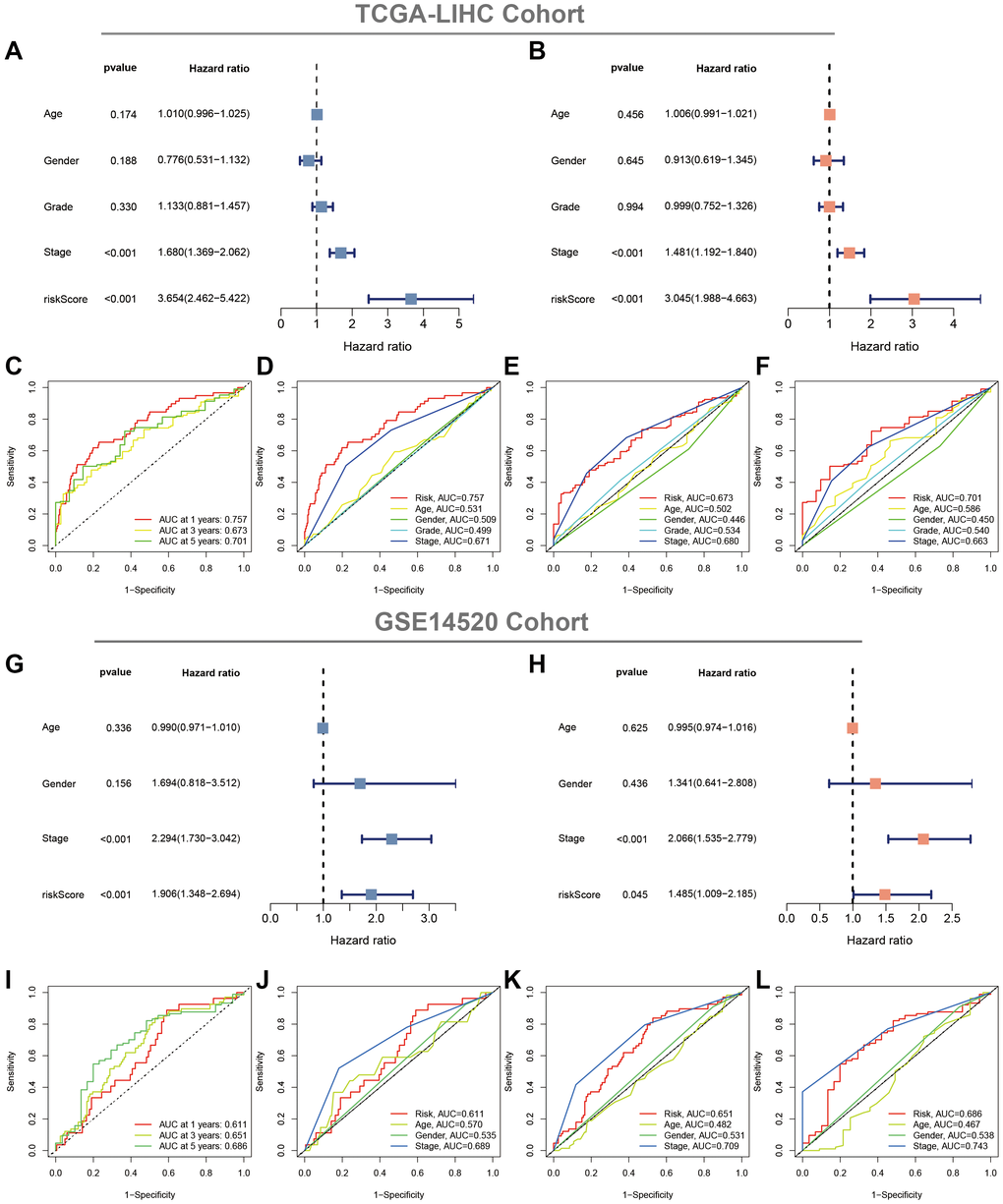 Uni- and multi-Cox regression analyses indicated that CAFRss was an independent prognostic indicator for patients with HCC, with hazard ratios of 3.654 (P < 0.001) and 3.045 (P < 0.001) (Figure 7A, 7B). Moreover, the stage was also identified as an independent prognostic indicator (P < 0.001). Additionally, ROC curves were performed to assess the predictive efficacy of CAFRss in predicting survival in the TCGA-LIHC cohort. The area under the curve (AUC) values for CAFRss in predicting OS at 1, 3 and 5 years were 0.757, 0.673 and 0.701, respectively (Figure 7C–7F). Furthermore, the CAFRss was also confirmed as an independent prognostic factor in the GSE14520 cohort (Figure 7G, 7H), with AUC values of 0.611, 0.651 and 0.686 at 1, 3 and 5 years (Figure 7I–7L).