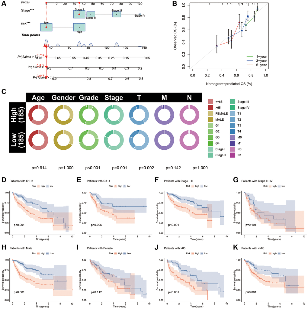 Circle plots of the clinical parameters revealed significant differences in grade, tumour stage and T stage between the two risk subgroups (Figure 8C). To assess the applicability of CAFRss in patients with different clinical subtypes, we performed a stratified analysis based on different clinicopathological parameters and further validated the survival in different subgroups. K-M curves demonstrated that individuals with different tumour grade and age had a better survival in the low-risk subgroup (P < 0.05) (Figure 8D–8K). Although there is no significant difference in survival between risk subgroups for women and stage III–IV patients, a noticeable trend towards the separation of the K-M curves was observed.