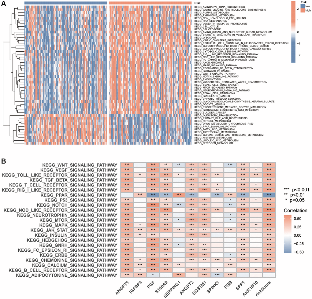 We first utilised GSVA to identify the pathways enriched in the different risk subgroups. The analysis revealed that the pathways enrichment of the MAPK, WNT, Notch, NOD-like receptor, RIG I-like receptor and mTOR signalling pathways, which are extensively involved in tumour evolution, in the high-risk subgroup. Additionally, the PPAR signalling pathway and multiple metabolic pathways were enriched in the low-risk subgroup (Figure 9A). Furthermore, a significant correlation was observed between the expression of 11 genes in the scoring system and key signalling pathways (Figure 9B).
