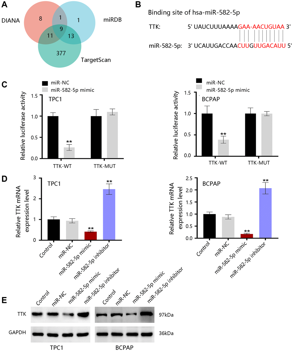 To further reveal the underlying mechanism, bioinformatics tools were employed to predict the upstream miRNAs of TTK. There were 29, 24, and 410 miRNAs in DIANA, miRDB, and TargetScan databases, respectively (Figure 10A). Nine consistent miRNAs include miR-582-5p, miR-449b-3p, miR-376a-2-5p, miR-524-5p, miR-212-3p, miR-132-3p, miR-520d-5p, miR-4801, and miR-5697. We chose miR-582-5p as a potent regulator for further validation in PTC and the binding site was shown in Figure 10B. Luciferase activity was significantly inhibited by miR-582-5p in the wild-type reporter, while no change in the mutated reporter in two PTC cells (Figure 10C). Moreover, TTK expressions were downregulated upon miR-582-5p mimics transfection, while the expressions were upregulated upon miR-582-5p inhibitor transfection (Figure 10D, 10E). These results indicated that miR-582-5p negatively regulates the TTK expression.