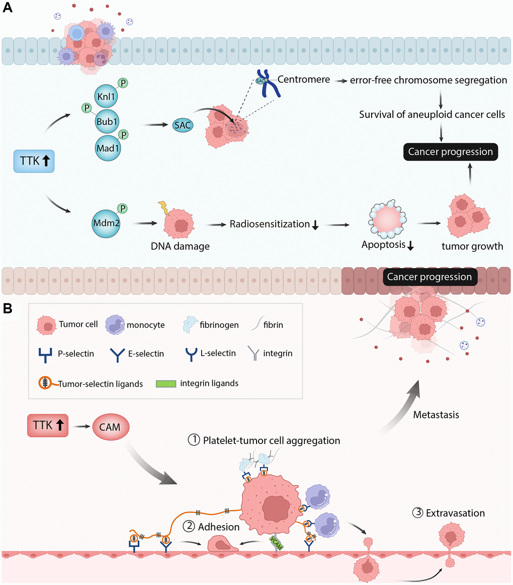 TTK plays a regulatory role in cancer cell proliferation, cell cycle, and apoptosis. Knockdown of TTK inhibited proliferation and increased apoptosis of gastric cancer cells through the Akt-mTOR pathway [31]. TTK depletion inhibited ovarian cancer cell proliferation by disturbing cell cycle progression [32]. In our study, PTC cell proliferation was suppressed, apoptosis was increased and the cell cycle was arrested after TTK was knockdown. The SAC is a conserved mitotic checkpoint that ensures accurate chromosome segregation during mitosis [33]. The inactivation of SAC in cancer leads to unequal segregation of chromosomes during mitosis, resulting in aberrant chromosomal numbers and cellular aneuploidy, hence enhancing chromosomal instability and the frequency of mitotic defects [34]. The protein kinase TTK is required for SAC activation [35]. Through Knl1, Bub1, and Mad1 phosphorylation sequentially, TTK can promote checkpoint activation and recruit checkpoint proteins to kinetochores in mitosis progress to ensure error-free chromosome segregation [36]. Elevated levels of TTK allow the survival of aneuploidy cancer cells and its overexpression has been observed in multiple cancers. TTK knockdown in glioblastoma and colorectal cancer cell lines reduced cell viability, led to abnormal cell progression and increased apoptosis [29, 37]. Similarly, the depletion of TTK decreased colonic survival and increased apoptosis in the pancreatic ductal adenocarcinoma cell line [14]. Therefore, the authors speculated that TTK overexpression might activate SAC through phosphorylating the substrates to promote cancer cell growth. In addition to the regulation of mitosis, TTK also facilitates DNA damage through phosphorylating Mdm2 [38]. DNA damage reduced radiosensitization and decreased cancer cell death, promoting cancer progression [39]. These findings revealed that TTK was essential for tumor cell growth in the aspects of proliferation, cycle, and apoptosis (Figure 11A).
