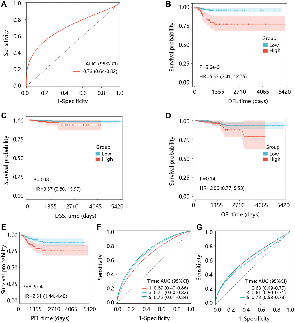 Firstly, the receiver operating characteristic (ROC) curves were drawn to determine the diagnostic value of TTK in PTC. Next, the effect of TTK on clinical outcomes was analyzed by the Kaplan-Meier plotter method. Disease-free interval (DFI) refers to the measure of time after treatment during which no regional recurrence/distant metastasis is found [20]. Disease-specific survival (DSS) refers to the percentage of people who died from a specific disease in a defined period [21]. Overall survival (OS) is defined as the time from the operation to death from any cause [22]. Progression-free interval (PFI) was measured from the date of initial treatment randomization to the time of disease recurrence [23].