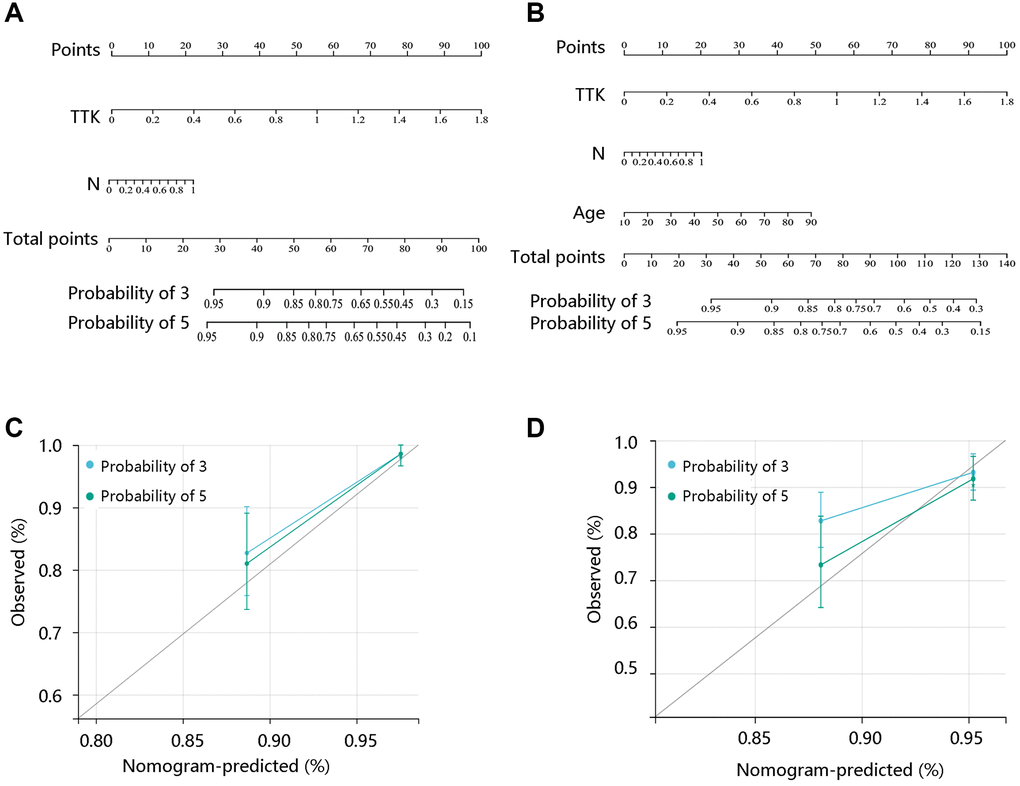Following this, its predictive value for survival status was evaluated using the R package “timeROC”. The Cox regression analyses were conducted to obtain the independent risk factors for PTC. Finally, nomogram models were constructed and the calibration curves were plotted.