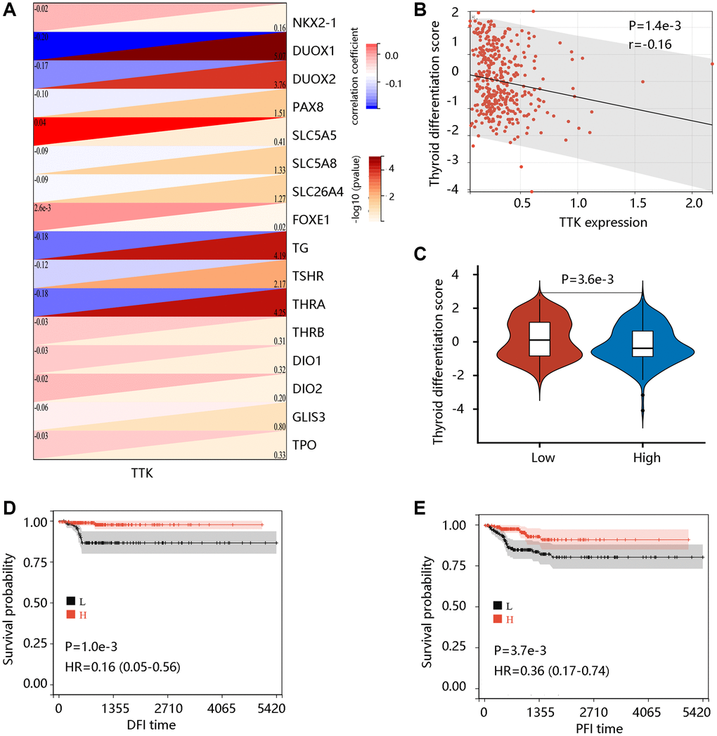 To examine the potential role of TTK in PTC dedifferentiation, we analyzed the correlation of TTK expression with TDS. TTK was negatively correlated with the expression of 16 thyroid-specific genes (Figure 4A). TTK had a negative correlation with TDS, and patients in the TTK-H presented markedly lower TDS (all P < 0.05) (Figure 4B, 4C). Interestingly, high TDS was significantly related to favorable DFI and PFI (all P < 0.05) (Figure 4D, 4E). These results suggested that TTK might affect patient prognosis by influencing PTC dedifferentiation.