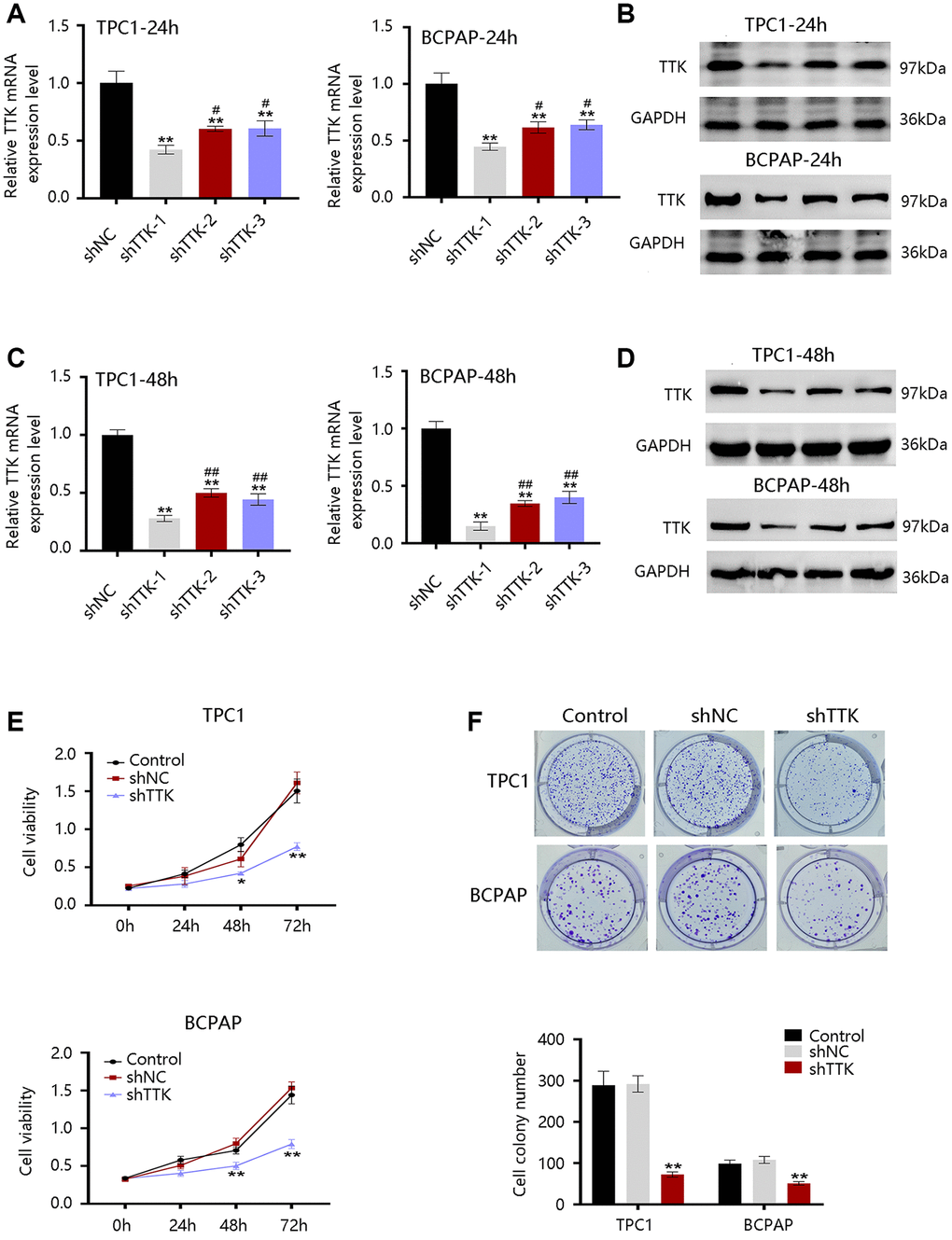 The TTK overexpression and its clinical value in PTC promoted us to investigate its oncogenic effect in PTC. TTK was knocked down in TPC1 and BCPAP cells using TTK-targeting shRNA vectors. We selected shRNA-1 for all following experiments due to its highest knockdown efficiency as determined by the qRT-PCR and western blotting results (Figure 5A–5D). The TTK-knockdown TPC1 and BCPAP cells significantly suppressed cell proliferation as exhibited by CCK-8 (Figure 5E). Consistent findings were observed in the colony formation assay (Figure 5F). These data indicated that TTK might accelerate PTC cell growth.