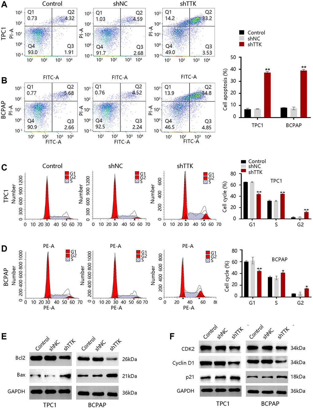 To explore the mechanism of TTK regulating PTC cell growth, we performed analyses of cell apoptosis and cell cycle progression. TTK Knockdown increased TPC1 and BCPAP cell apoptosis (Figure 6A, 6B). Besides, the TTK-knockdown in two PTC cells significantly reduced G1-phase cells, while increasing S-phase and G2-phase cells compared to the control group (Figure 6C, 6D). Decreased Bcl2 protein expression but increased Bax protein expression further confirmed the apoptosis suppression by TTK (Figure 6E). Moreover, the expression of cell cycle-related proteins CDK2 and Cyclin D1 were downregulated and p21 was upregulated in TTK-knockdown TPC1 and BCPAP cells (Figure 6F). These results revealed that TTK might promote PTC cell growth by suppressing apoptosis and facilitating cell cycle progression.